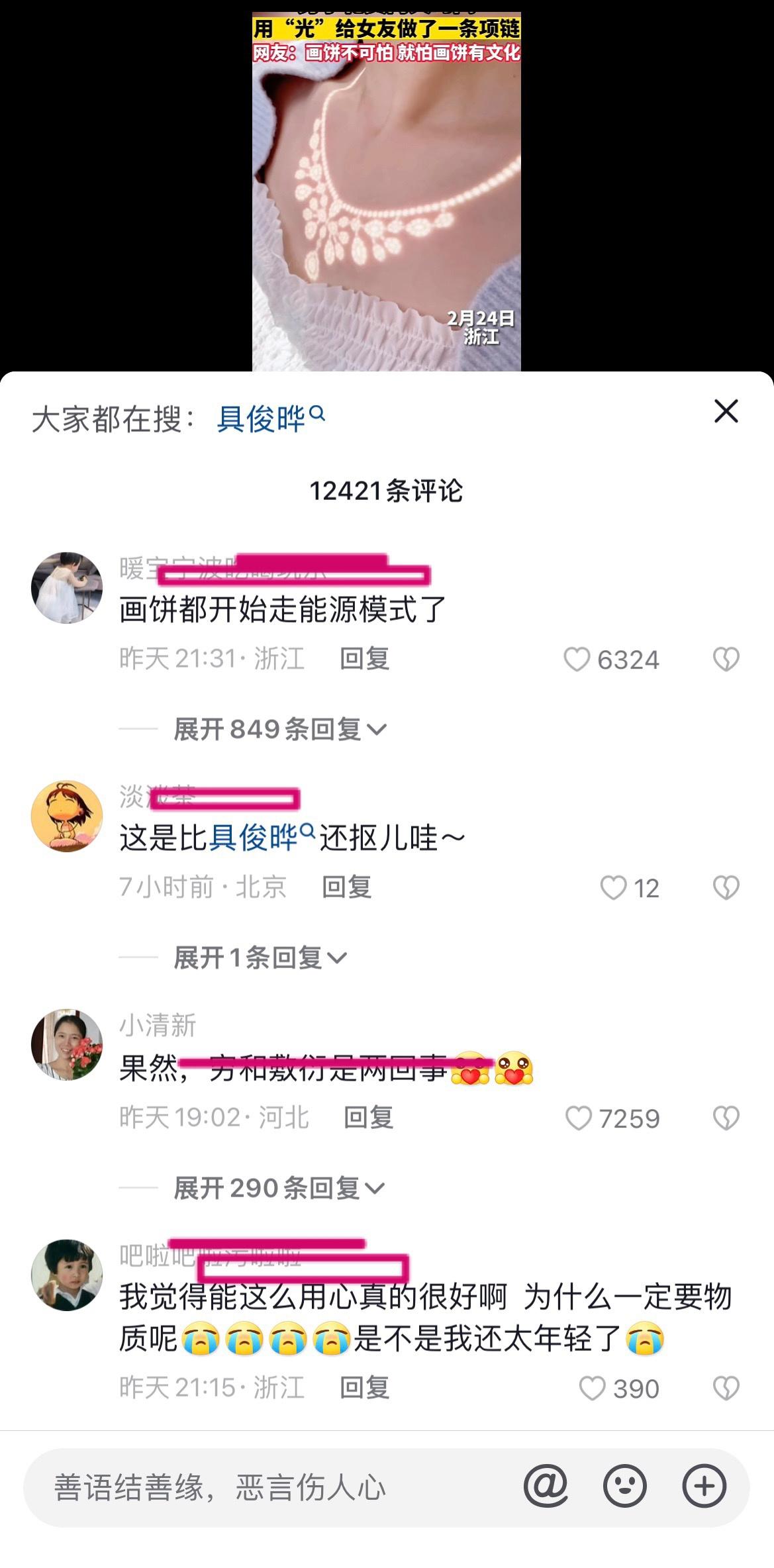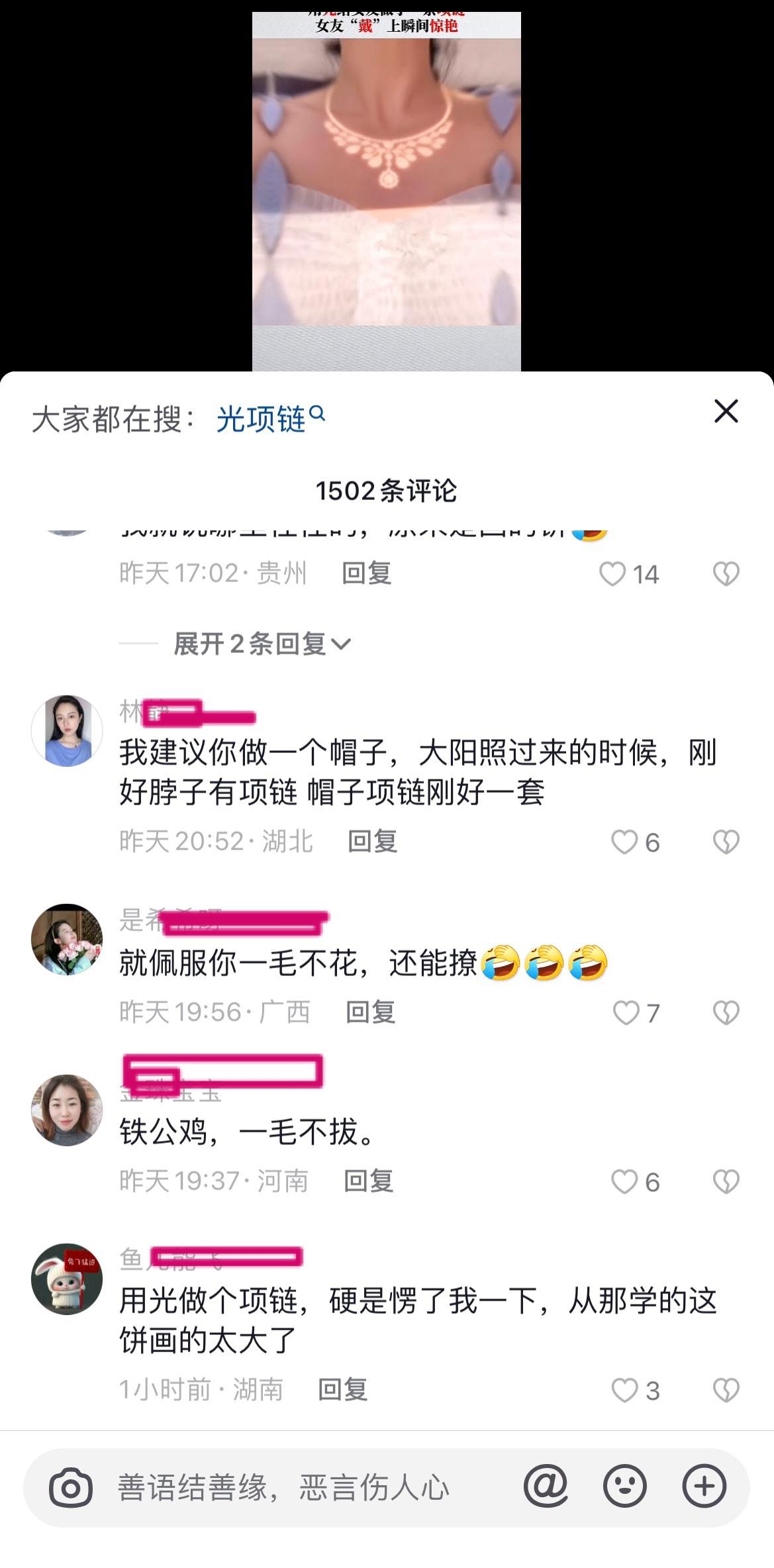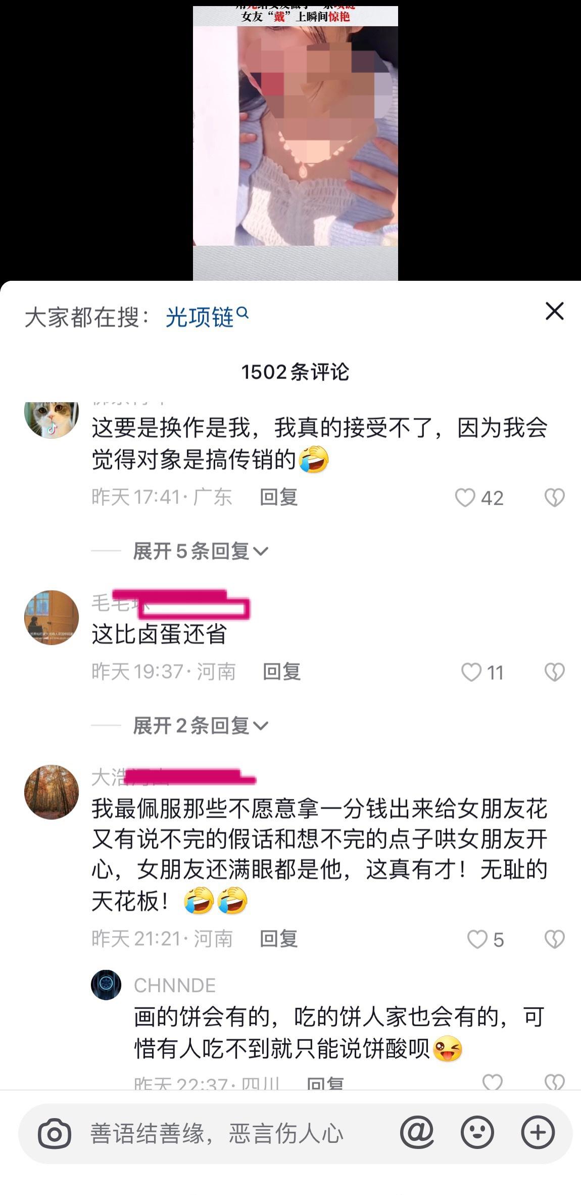 男子用光为女友做了一条项链,被网友评价为「新能源大饼」,如何看待此事?反映了什么样的社会观念? ------------------------------------ 一会儿又是情绪价值,给了情绪价值又说没用