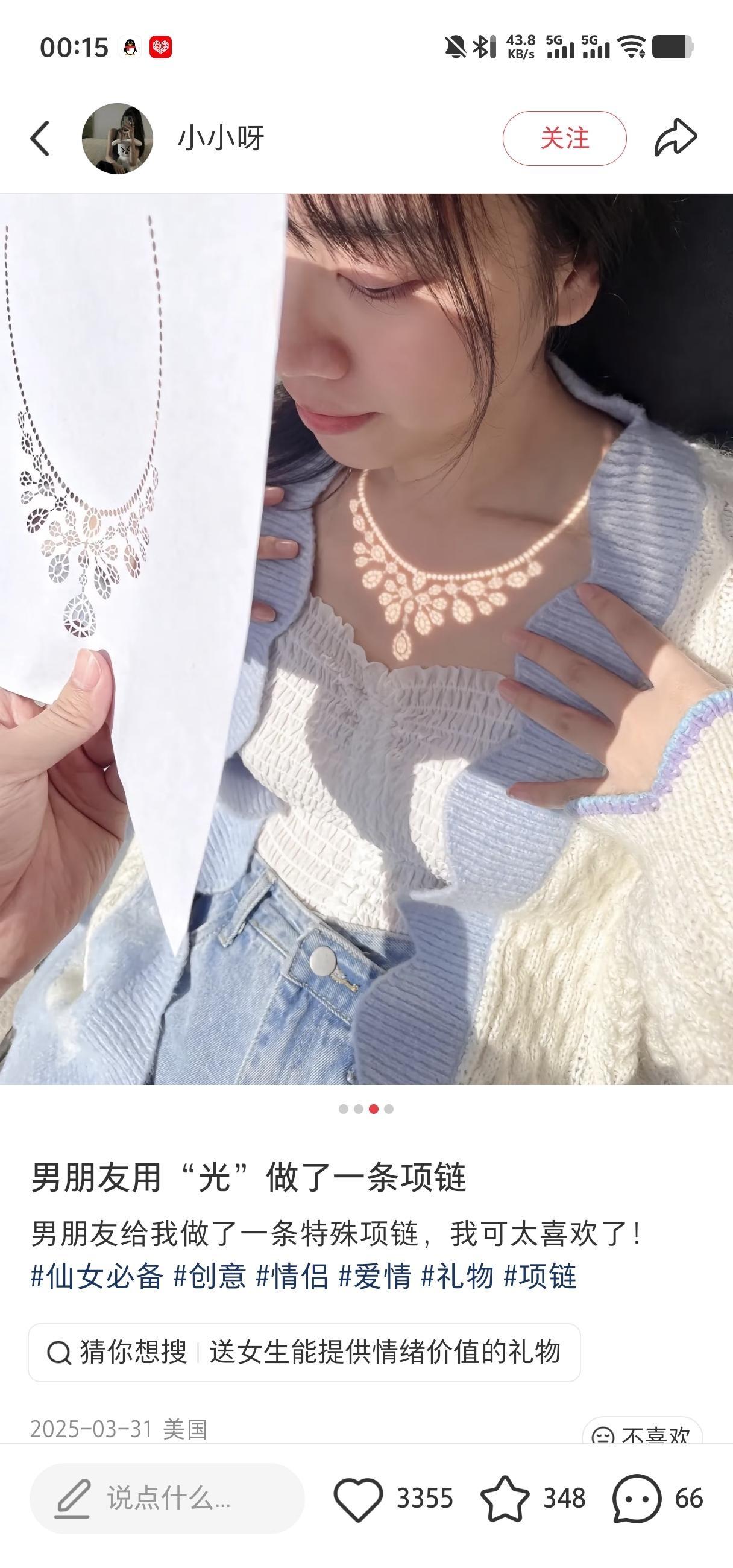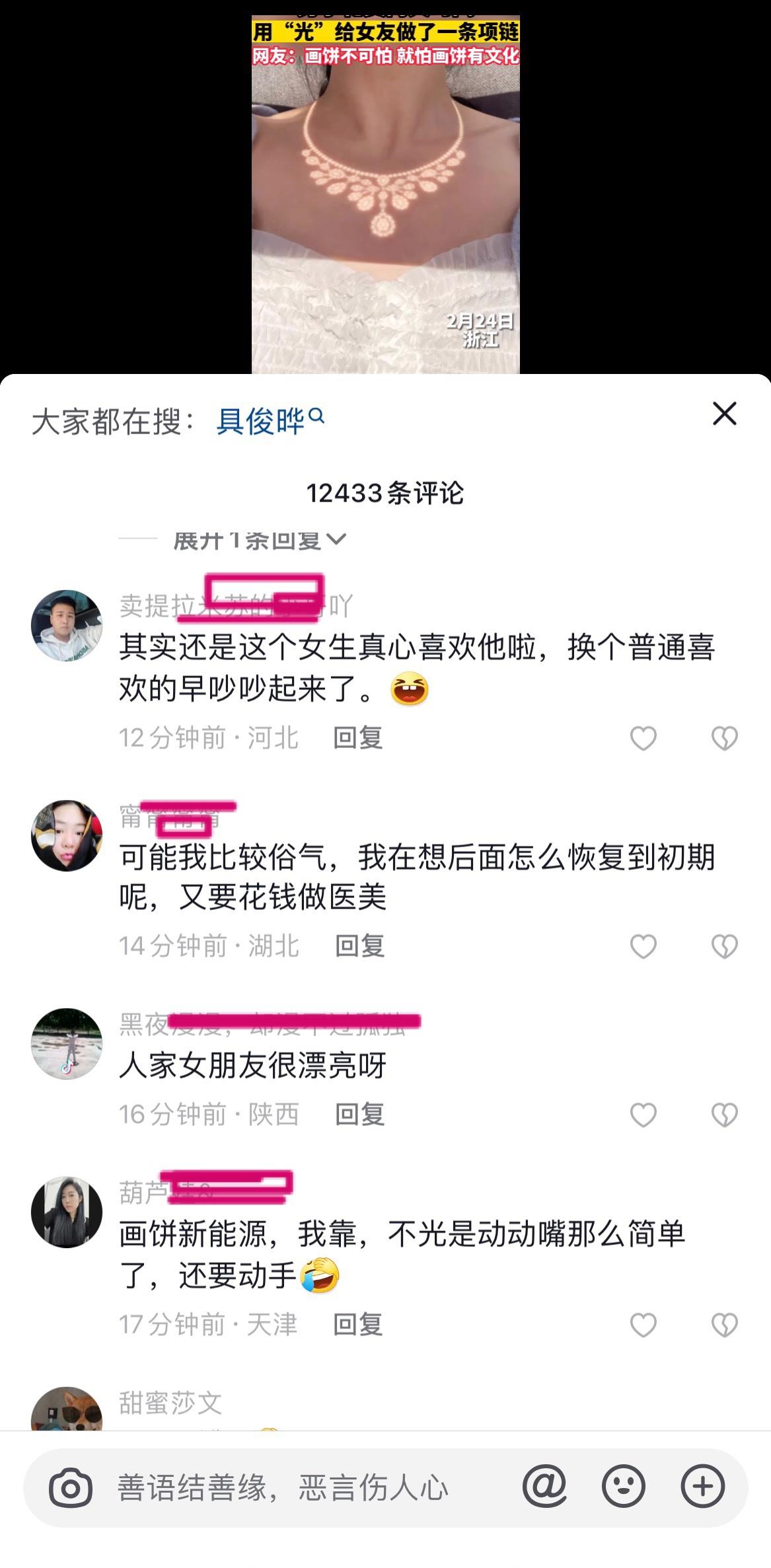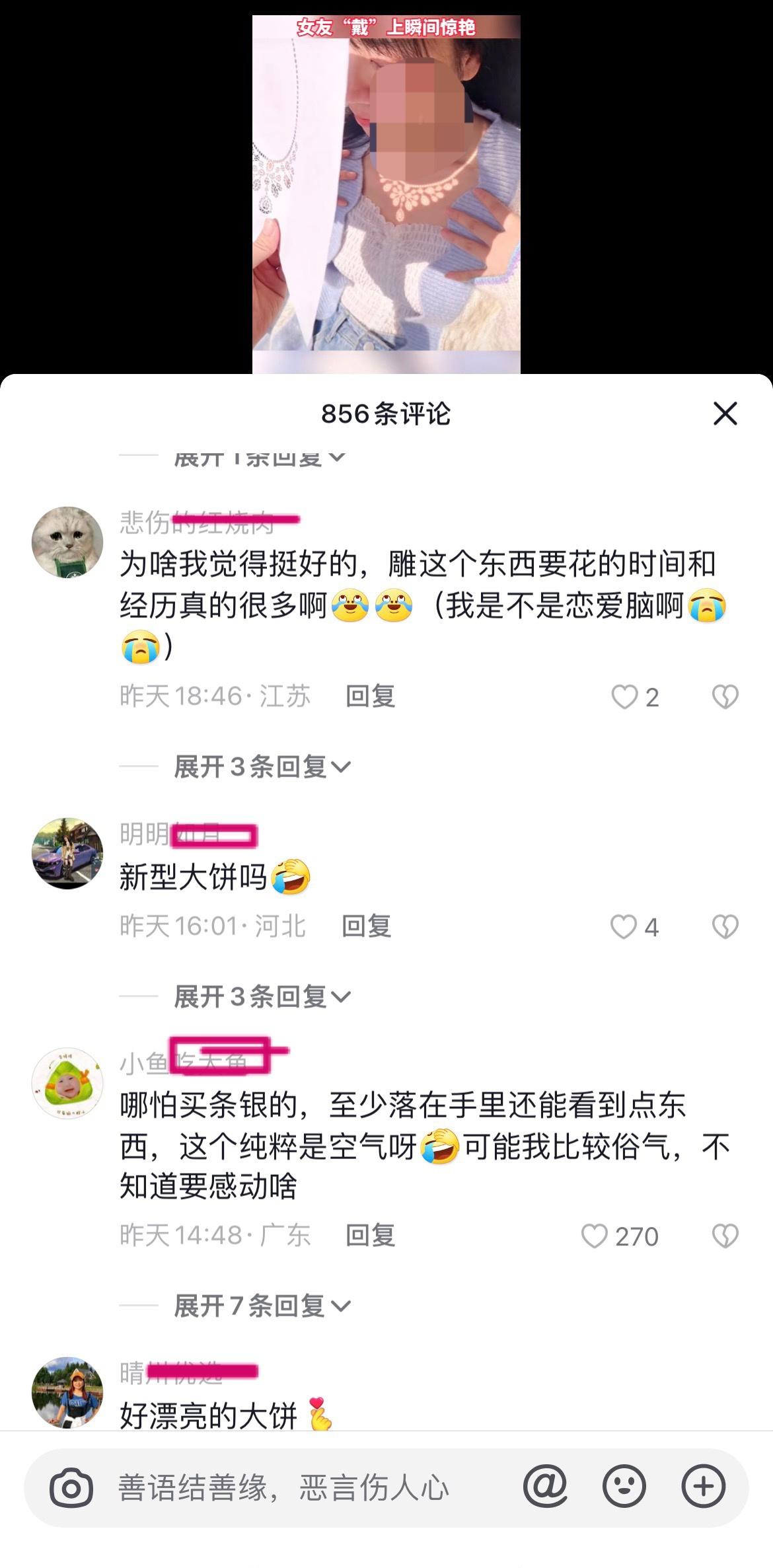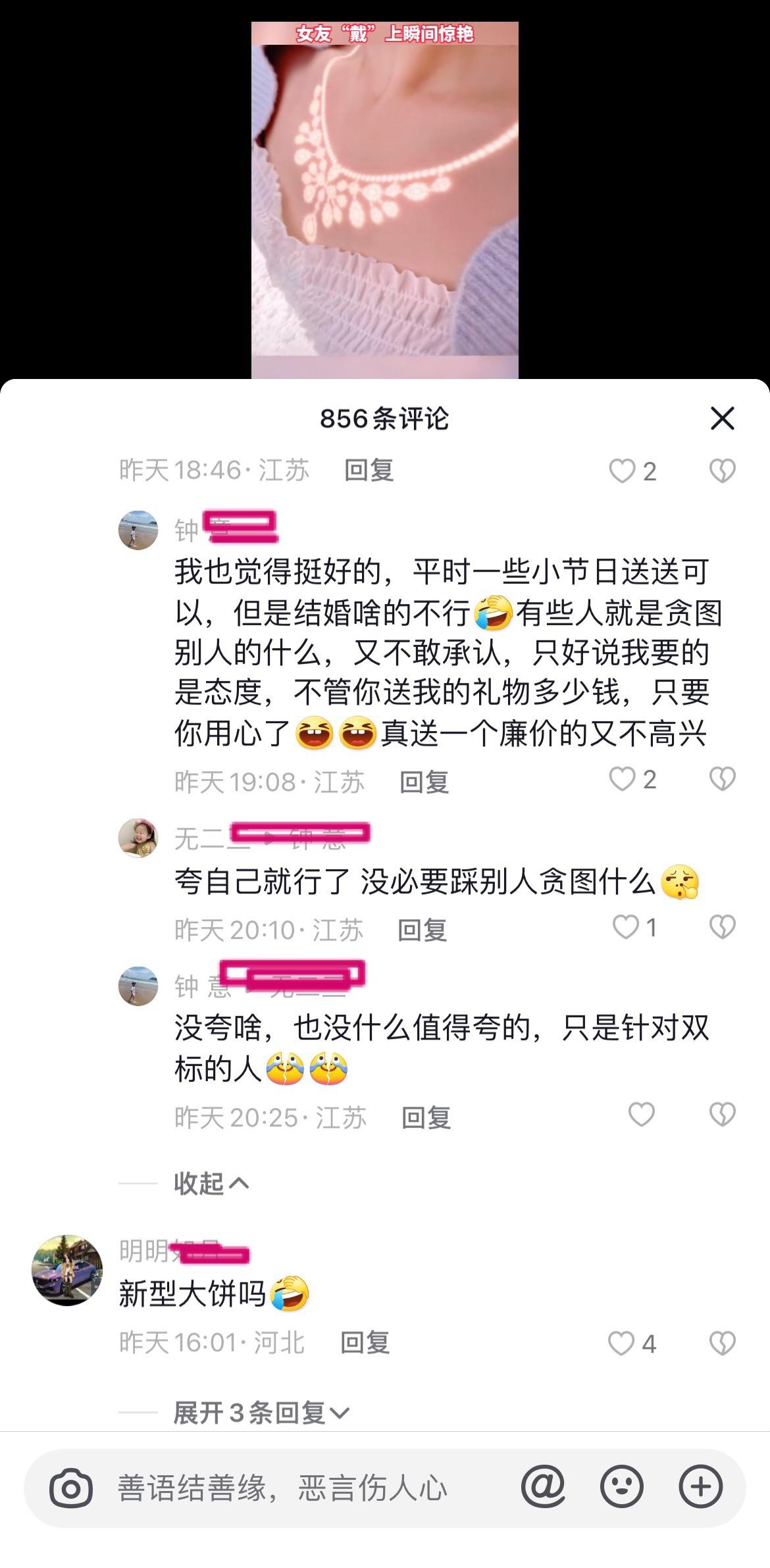 男子用光为女友做了一条项链,被网友评价为「新能源大饼」,如何看待此事?反映了什么样的社会观念? ------------------------------------ 一会儿又是情绪价值,给了情绪价值又说没用