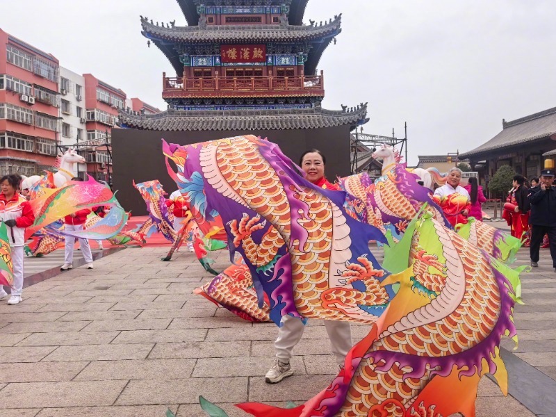 2026年正月初九,甘肃天水秦州区双桥北路西关古城启汉楼前,欢快的旋律响起。来自市内的30多支广场舞团队身着靓丽服装,手持五彩绸带,载歌载舞,精彩的表演引得现场观众阵阵喝彩。