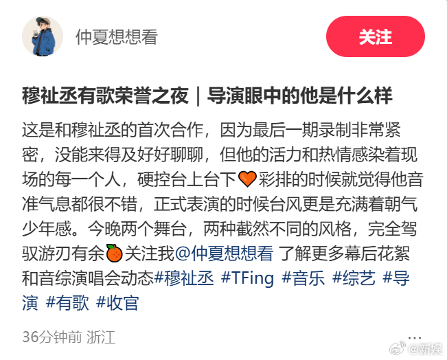 有歌2导演夸穆祉丞有歌导演夸穆祉丞硬控台上台下《有歌2》的导演夸穆祉丞了:活力和热情硬控台上台下、音准气息都不错,充满少年感,驾驭舞台游刃有余!活力、热情、专业,这就是穆祉丞~这个穆祉丞也是硬控导演了,期待今晚的两个舞台~