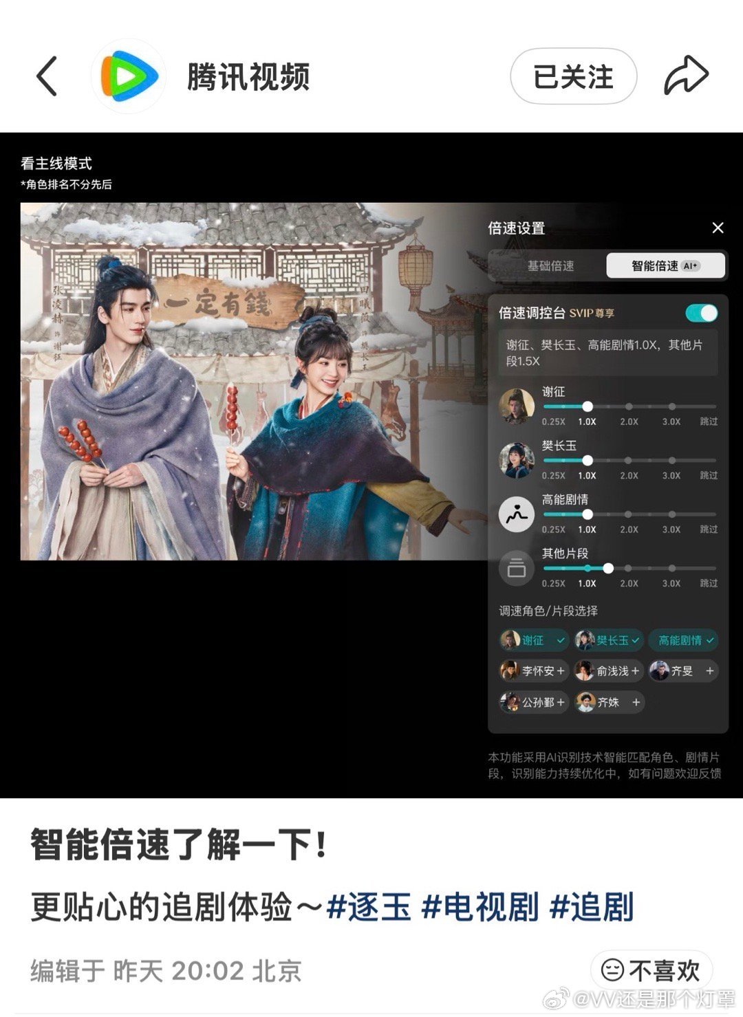 逐玉 智能倍速看剧庆余年2都没这种待遇一日追剧卡和智能倍速看剧一出,所有在鹅和桃播过剧的流量粉全跑出来喊冤了,直呼没见过逐玉这种级别的保送生