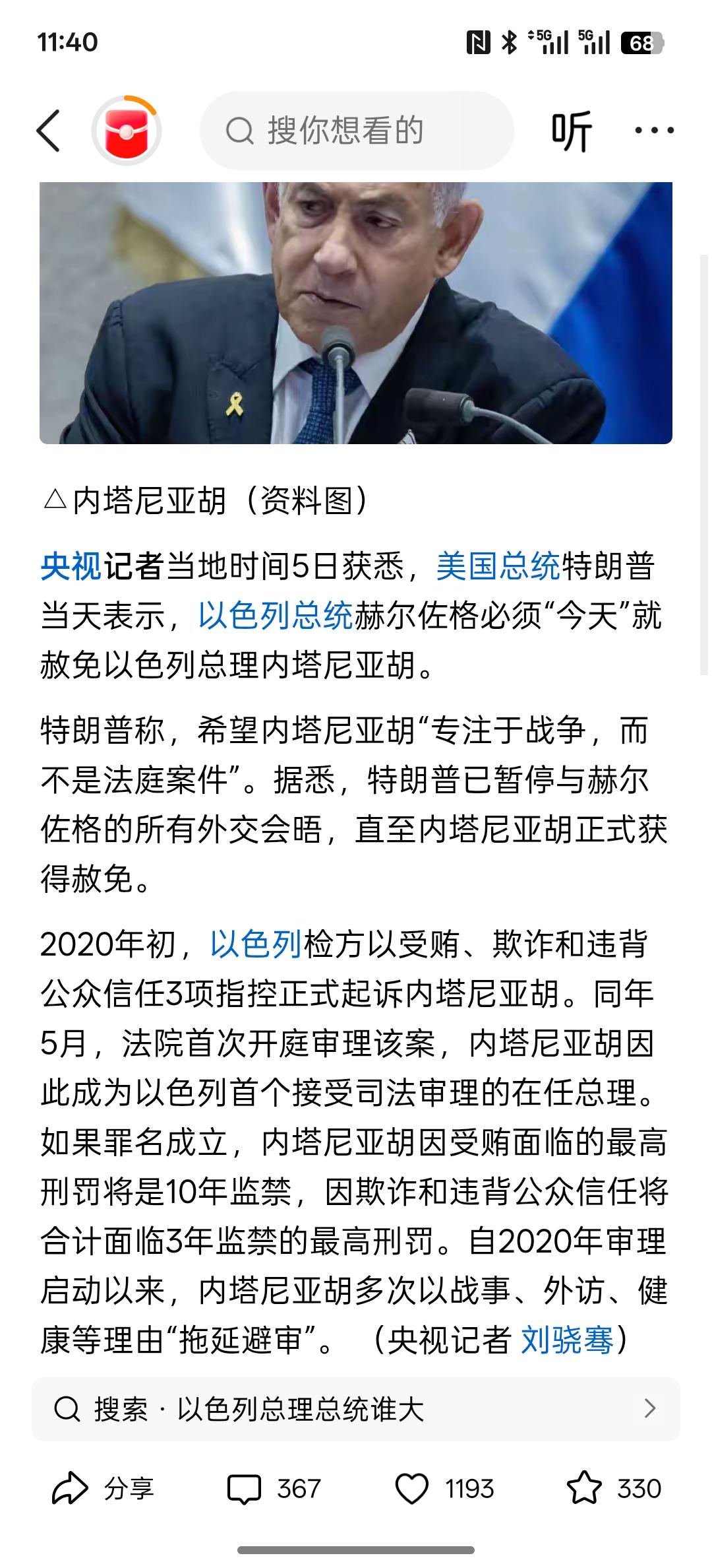 特朗普要求立即赦免以色列总理,这特朗普与内塔尼亚胡是一伙的,小在以色列总理内塔尼亚胡,在以色列官司缠身,如果一旦被定罪的话,至少要判十年以上的监禁!现在特朗普给以色列施压!要求其赦免以色列总理!专心开展战争!简直就是一场荒唐!都成了战争分子,扰乱世界安全局势!采用这种方式逃脱罪行,那岂不是成了司法的耻辱?