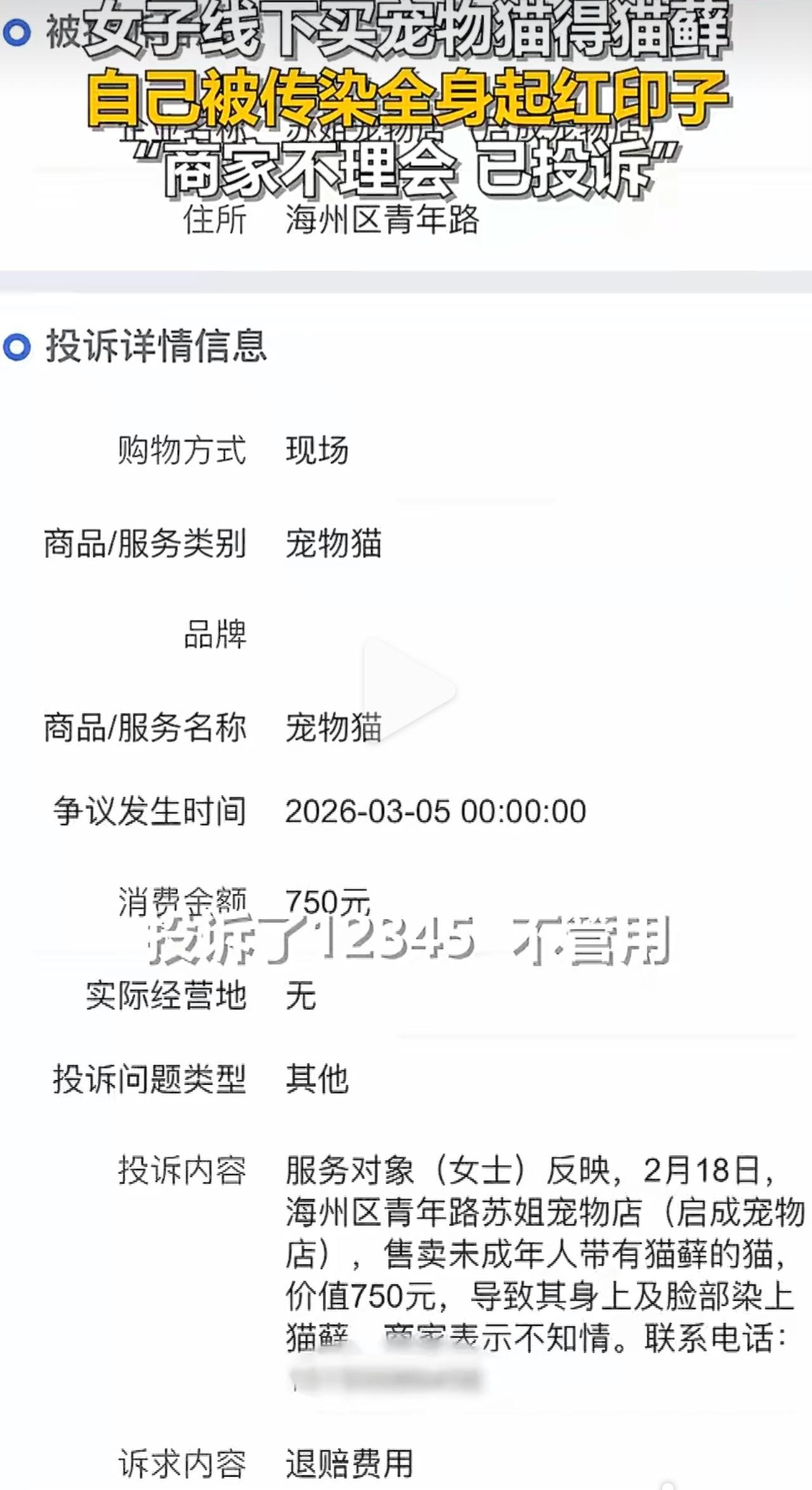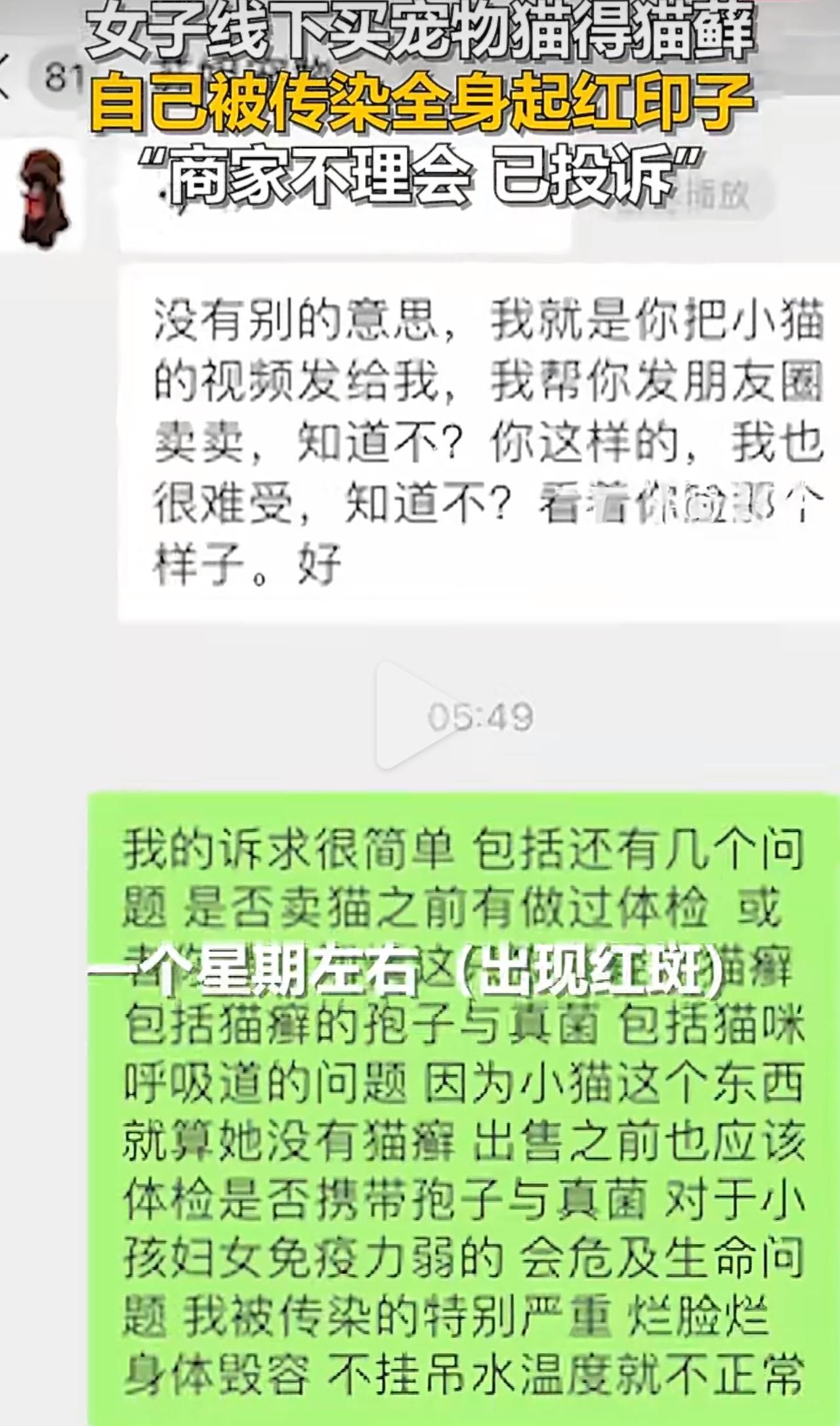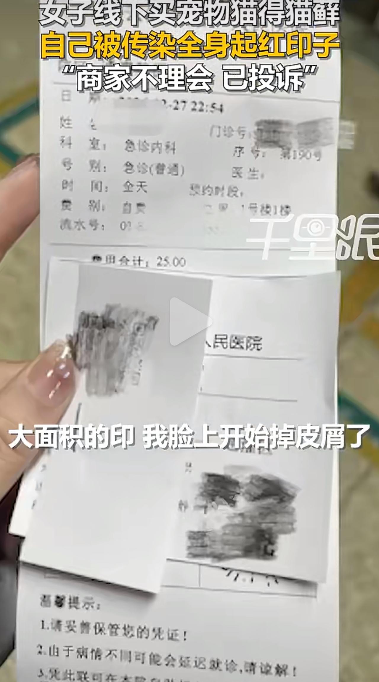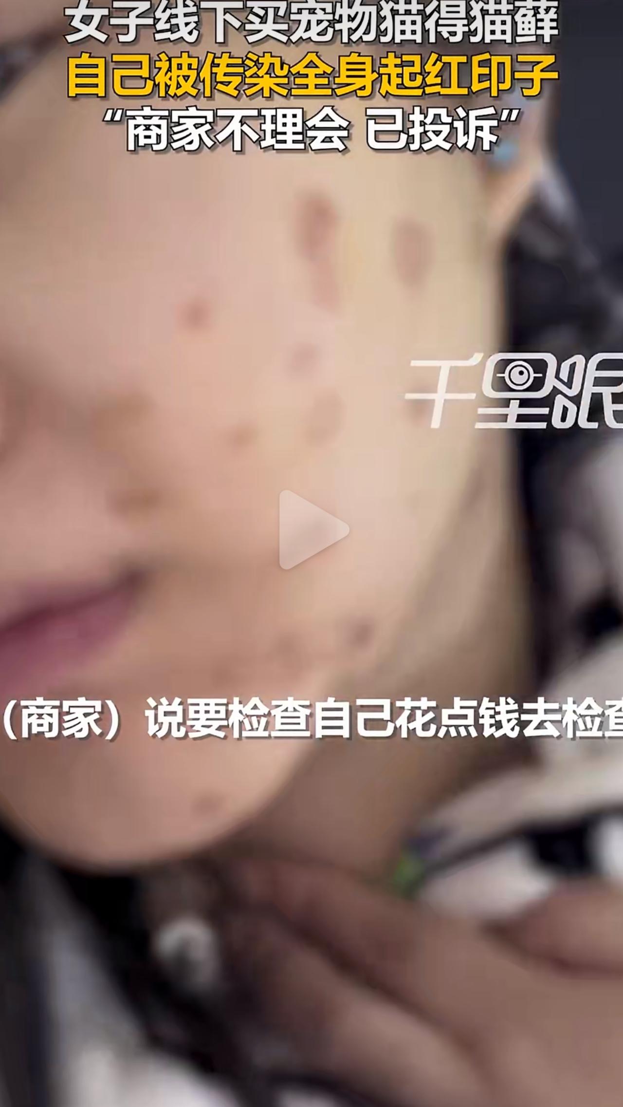 花800块买只猫当18岁生日礼物,没想到差点毁容,好好的欢喜事,直接变成了糟心事! 连云港这个刚成年的小姑娘,高高兴兴把小猫接回家,才过一周,身上就长满红斑,皮肤烂得脱皮,连脸都开始掉皮,要是留了疤,一辈子都受影响。 她本身免疫力就差,染上猫癣之后遭老罪了,又要花钱给猫治病,又要跑医院给自己涂药吃药,心里委屈,身体也疼。 去找商家理论,对方压根不想负责,要么让她把猫转卖,要么随便找个小诊所糊弄,退钱、赔医药费想都别想,连最基本的疫苗本都拿不出来,打电话投诉也没个结果。 现在好多人买宠物,光看长得可爱,根本不管健不健康,低价买的宠物,十有八九藏着病,商家嘴上说的保障,全是空话。 带病的猫狗随便卖,最后吃亏的,都是真心想养宠物的普通人。 买宠物真别光看脸,提前做检测、签好书面协议,一样都不能省,别让满心的喜欢,最后落得一身病,维权还没门。猫癣 猫癣和狗癣能够传染给人吗? 宠物健康