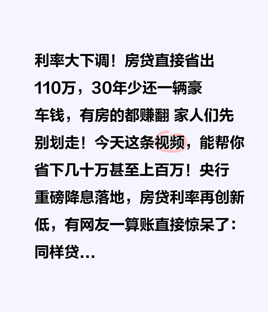 利率大下调!房贷直接省出110万,30年少还一辆豪车钱,有房的都赚翻 家人们先别划走!今天这条视频,能帮你省下几十万甚至上百万!央行重磅降息落地,房贷利率再创新低,有网友一算账直接惊呆了:同样贷365万、30年等额本息,利率从4.65%降到3.2%,总利息直接少还110万! 110万啊,相当于白得一套首付、一辆豪车,这波红利没吃到真的亏大了! 很多人第一反应是“不可能,绝对是噱头”,但我给你算笔明白账,数据真实可查。贷款365万,30年等额本息:原利率4.65%,月供约18820元,总利息高达313.5万;新利率3.2%,月供降到16000元,总利息仅203.5万。一减一省,整整省下110万,每个月少还2800多,压力直接减半! 转折点来了!不是只有新买房才能享受,存量房贷用户同样能薅羊毛。2026年最新政策,5年期以上LPR稳定在3.5%,首套商贷最低做到3.05%,公积金首套更是低至2.6%。不管你是去年买、前年买,甚至十年前买的房,只要是浮动利率,到了重定价日(每年1月1日或放款日),利率自动下调,月供跟着降,不用跑银行、不用重新签合同,躺着省钱! 但我必须提醒大家两个坑,别让红利白白溜走:第一,固定利率房贷转LPR浮动利率,才能享受降息;第二,重定价周期可以改成3个月,紧跟利率下行节奏,早调早省钱。还有人问,现在要不要提前还贷?记住:利率低于3.5%,没必要急着还,手里留着现金更灵活;利率高于4.5%,有闲钱再考虑提前还。 110万,对普通家庭来说,是孩子十几年的教育费,是父母的养老钱,是一家人十几年的生活费。这波降息,不是数字游戏,是国家给千万家庭的真金白银减负,让买房不再压垮人生,让月供不再掏空工资。 看着月供账单变少,我们才明白:安居乐业从来不是一句口号,而是实实在在的生活底气。不管你是刚需上车,还是正在还贷,都要抓住这波历史最低利率红利。 愿每个家庭都能减轻房贷压力,把钱花在旅行、陪伴、提升生活品质上,不用再为月供焦虑,真正过上轻松幸福的日子!
