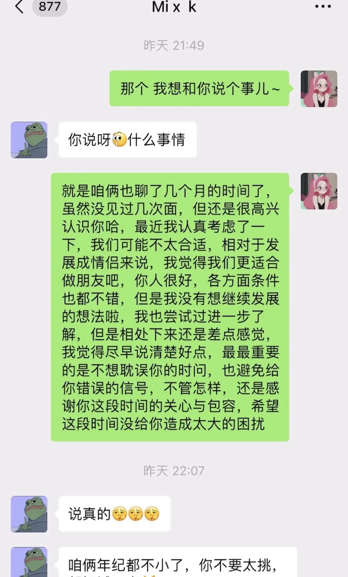 不合适终究还是不合适。经过两天的考虑和措辞,我跟相亲对象把话都说清楚了,不合适就是不合适不能强求在一起,突然觉得说完一身轻松,心情也不像前一阵比较郁闷了聊天记录截图