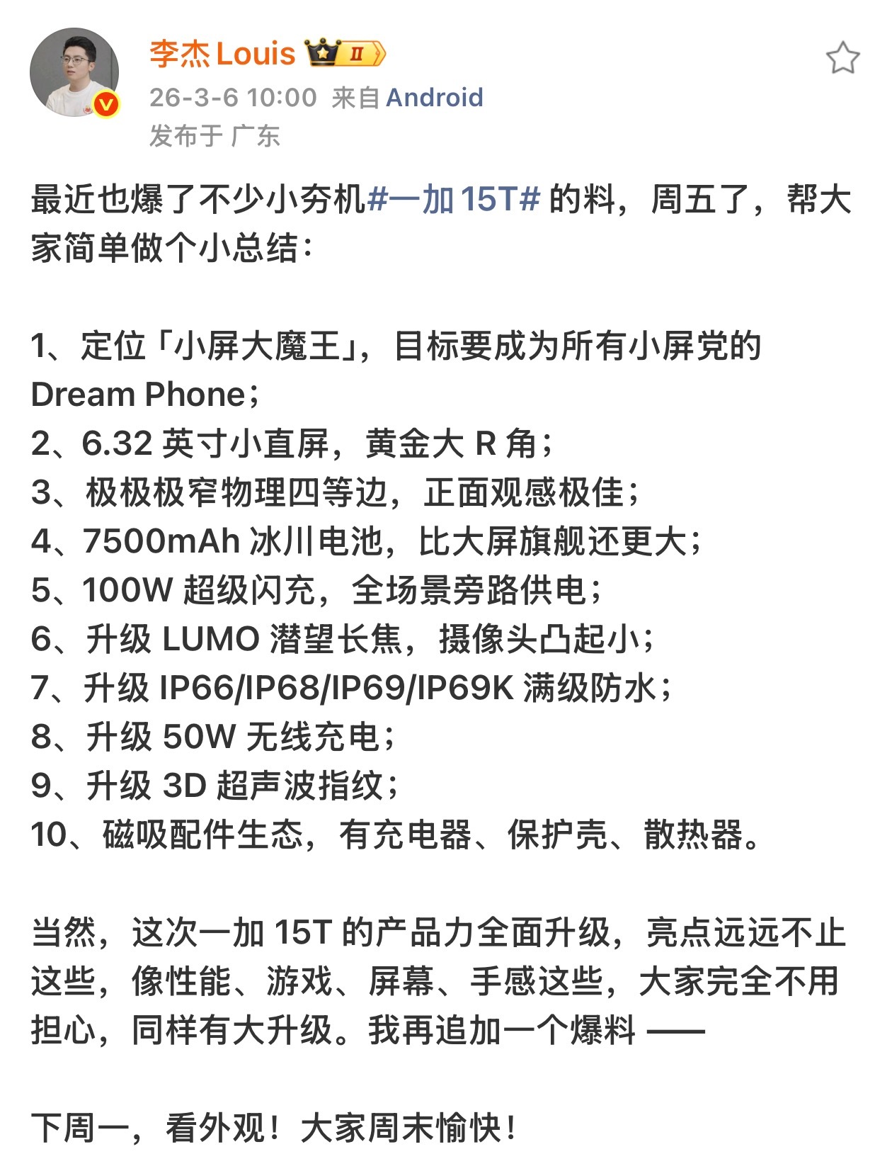 一加15t 应该算是“只差价格官宣”的状态了吧,其它信息基本都七七八八了