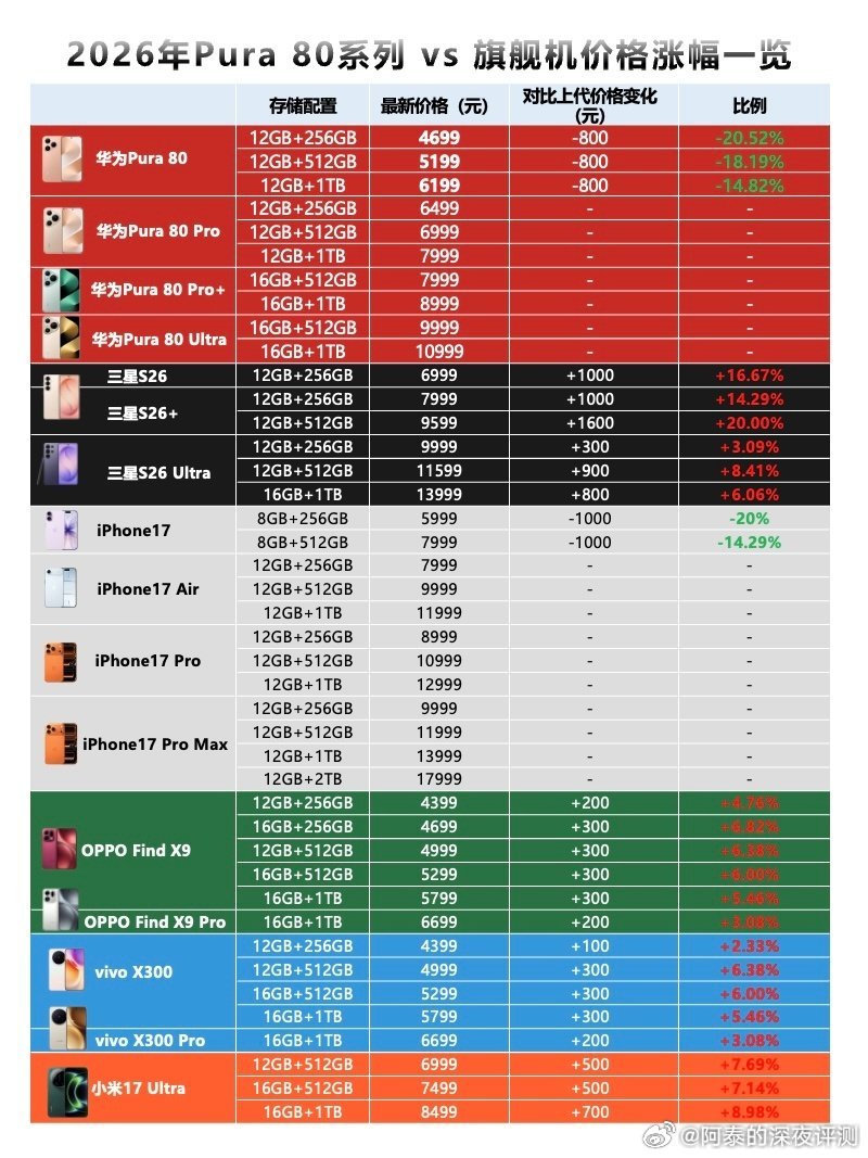 手机厂商3月初集中涨价该怎么选今年打算换手机的,想换赶紧换,后面估计涨价就望而却步了,目前看2026手机圈迎来全品牌涨价已经板上钉钉,国际品牌三星S26系列都没扛住,发布加价升杯,AI芯片成本暴涨倒逼行业提价。