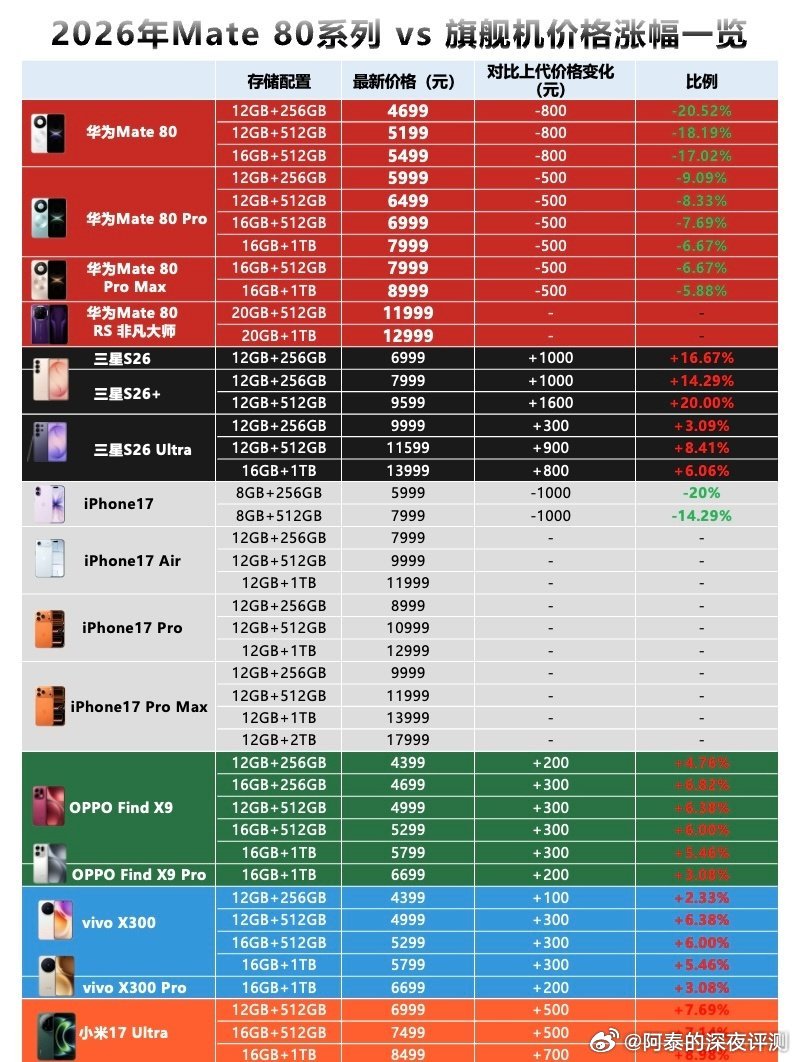 当然,目前看行业多品牌涨价,反而凸显了像华为这种高端产品线的性价比,比如华为Mate 80系列很有可能会成26年购机最优选!华为逆势操作,直接把性价比拉满!