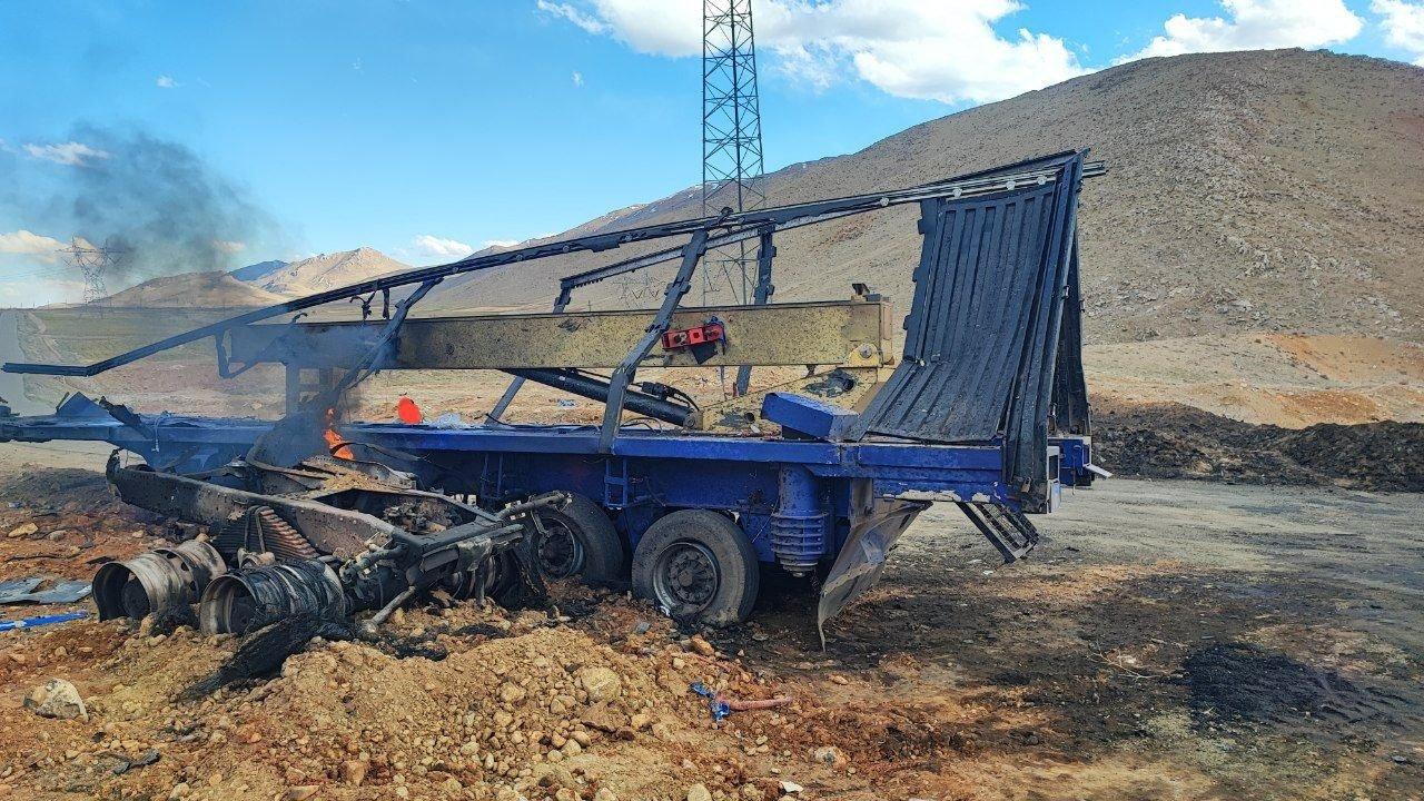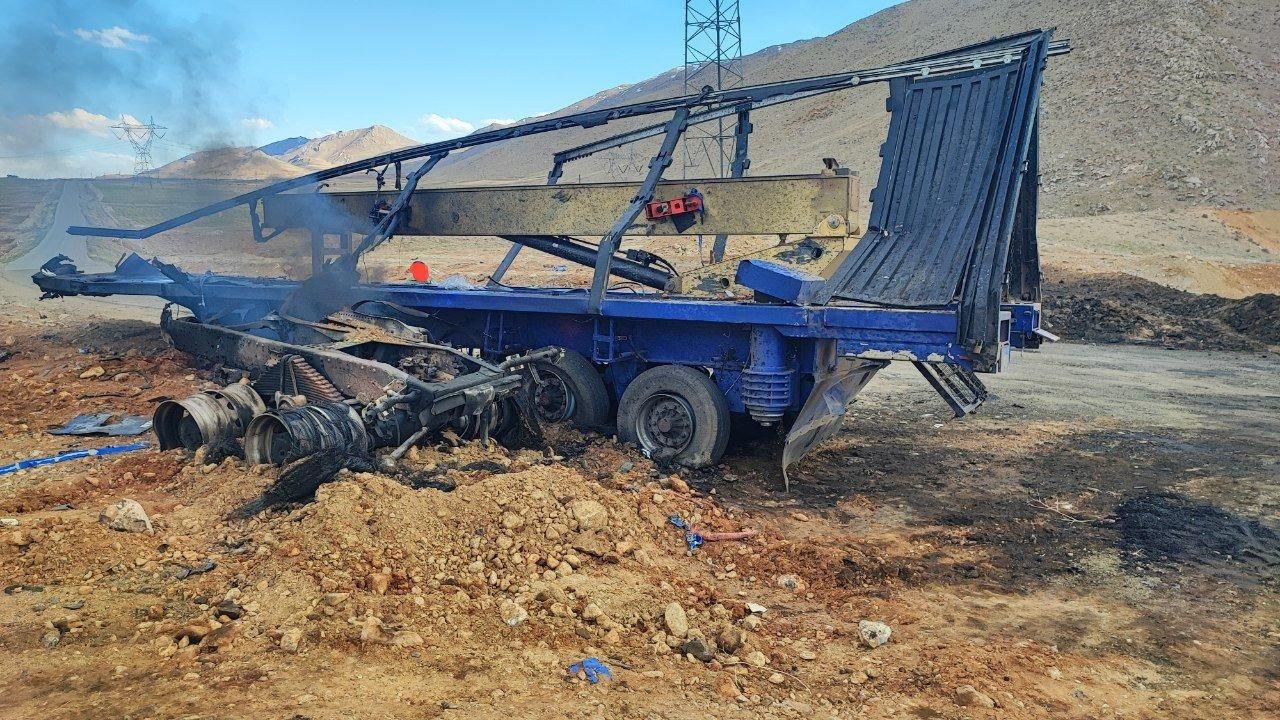 被摧毁的伊朗伊斯兰革命卫队导弹发射车。它很可能携带的是一枚“海巴尔·谢坎”固体燃料中程弹道导弹。