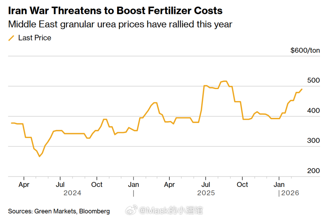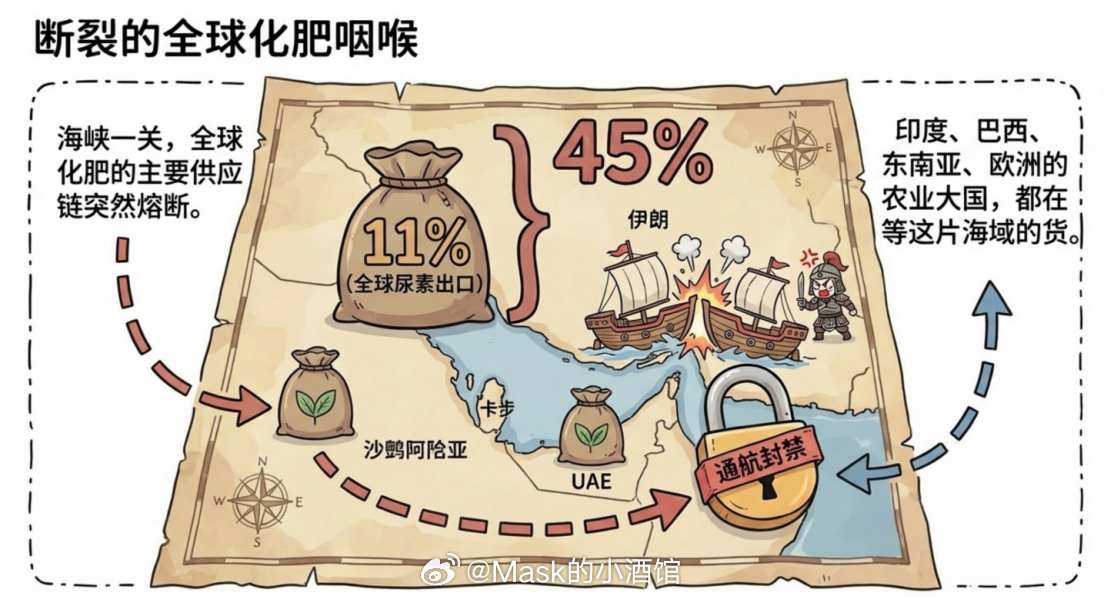 全球主要农业大国的氮肥,比如印度、巴西、东南亚、欧洲,相当大比例要从这片海域进口。但问题来了,因为美伊冲突,霍尔木兹海峡的通航基本上被封禁了。而海峡一关,等于化肥的主要供应链突然断了,那化肥不就得跟着涨价?