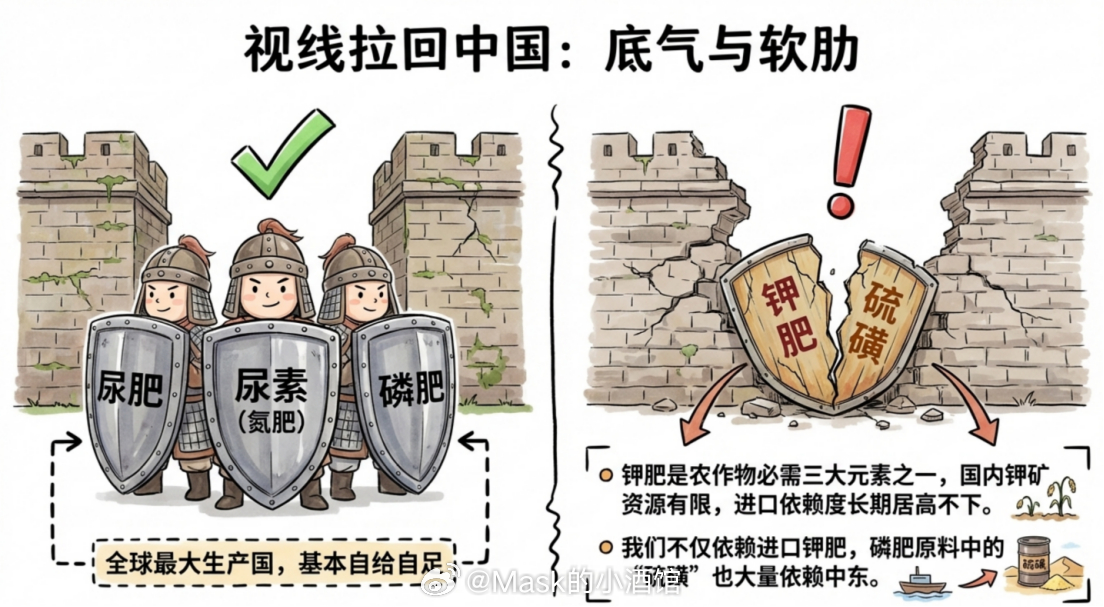 政策层面也在快速响应。我们早在2月初就发出通知,要做好2026年春耕及全年化肥保供稳价工作,鼓励国产硫磺优先供应国内磷肥企业。磷复肥工业协会进一步宣布,2026年8月之前不安排磷肥出口配额,把产能全留给国内春耕。但有一个问题政策暂时解决不了:钾肥。国内钾肥产能主要在青海和新疆,产量有限,短期内进口的缺口很难用国产来补。如果中东钾肥断供时间拉长,这块会成为国内化肥成本压力最集中的地方。