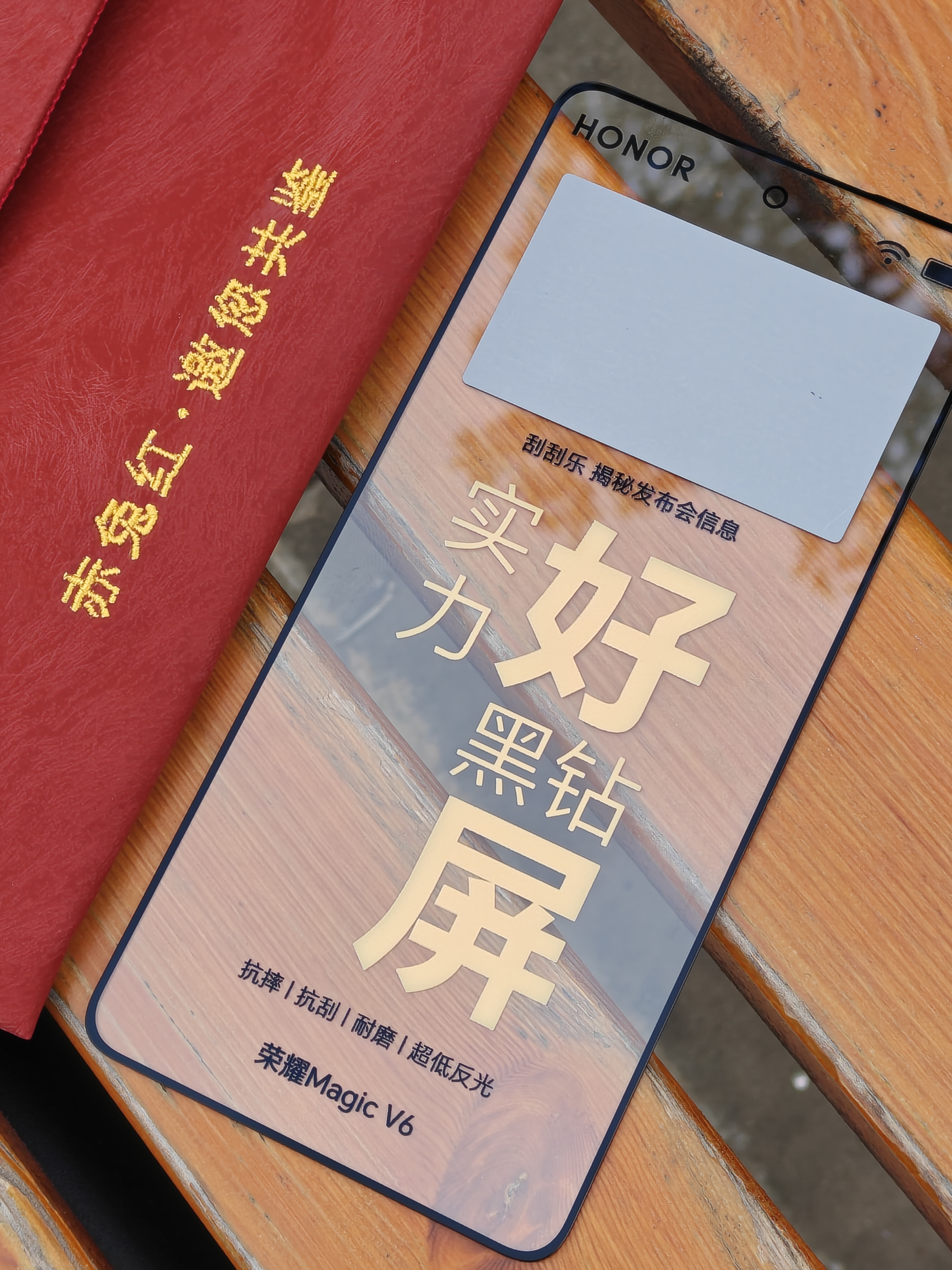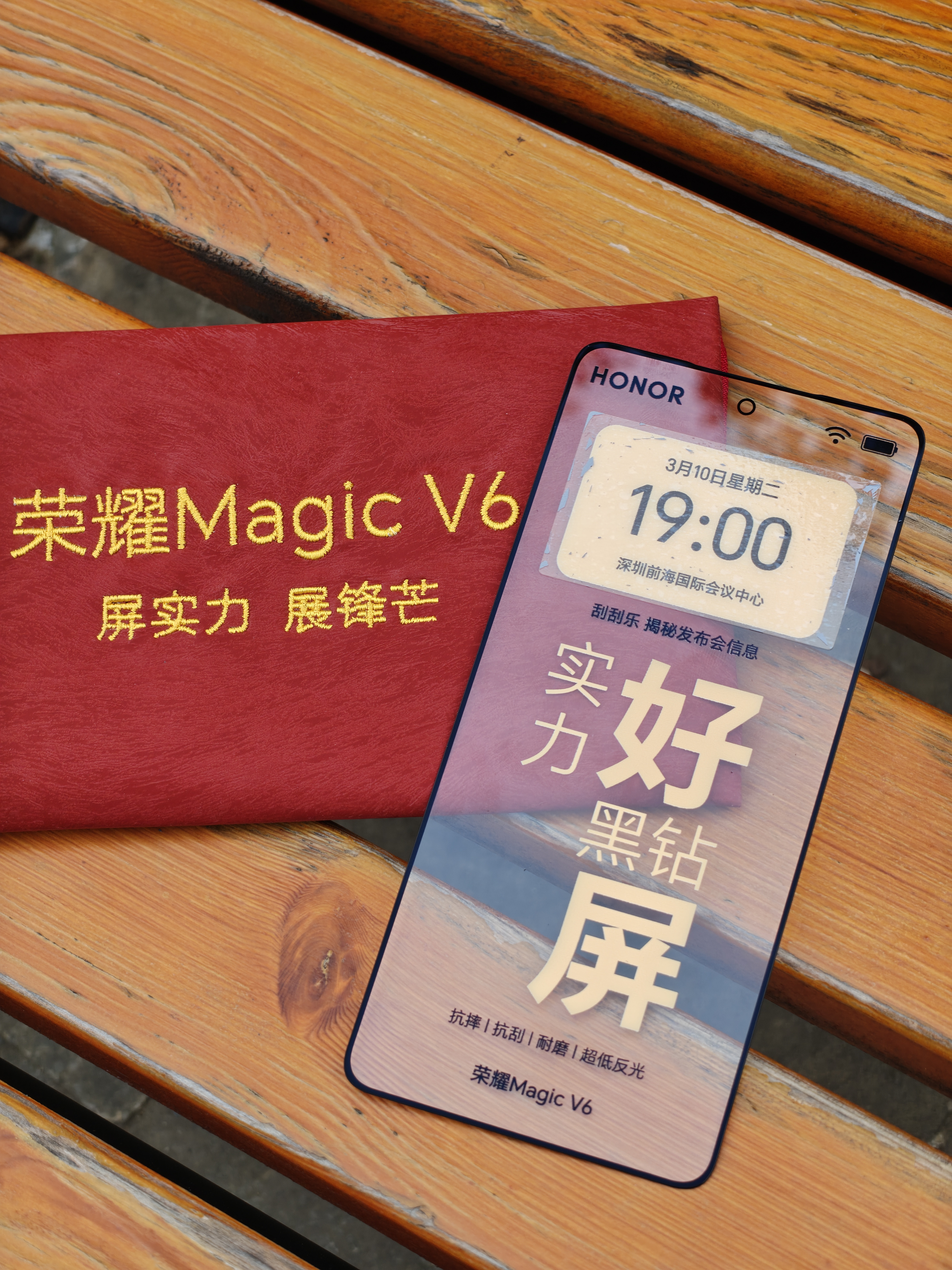 收到了荣耀Magic V6发布会的邀请函了,一块至臻黑钻屏,阳光下观感也非常棒,拿砂纸刮了好一会儿也没有任何划痕,3.10深圳不见不散。 折叠屏最好的屏幕长什么样