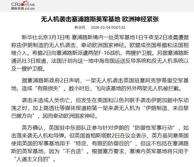 有人想浑水摸鱼,塞浦路斯英军基地遇袭,英国调查后发现不是伊朗干的 几天前,塞浦路斯这个国家里,有个英国的军事基地,被无人机袭击了。这事刚发生,英国就说,袭击他们的无人机是伊朗造的,言外之意就是,这事是伊朗干的。 但说话得讲证据,不能瞎猜。英国后来仔细查了查,结果反转了——他们承认,这事根本不是伊朗干的。 那架无人机也只是看着像伊朗的“见证者136”,不确定就是伊朗产的,更不能证明是伊朗放的。 先说清楚背景,塞浦路斯是地中海边上的一个小岛国,挨着欧、亚、非三个大洲,位置很关键。 以前英国殖民过它,后来塞浦路斯独立了,英国还在那儿留了两个军事基地,这次被袭击的就是其中一个。 袭击是3月1号半夜到2号凌晨发生的,一架无人机飞得很低很慢,躲开了雷达,撞在了基地的机库上,还着了火。好在没人受伤,损失也不算大,另外还有两架无人机往基地飞,被拦下来了。 为啥一开始怀疑伊朗呢?主要是那架无人机,看着像伊朗的“见证者136”。这款无人机伊朗造的,飞得时候声音像摩托车,造价便宜,操作也简单,很多地方都有。 再加上当时美国和以色列正在打伊朗,局势很紧张,英军一看无人机像伊朗的,就先怀疑伊朗了。 可仔细一查,就发现说不通。英国的官员说,这架无人机根本不可能从伊朗本土飞过来,而且伊朗也没理由袭击英军基地。 当时英国已经说了,不让美军用这个基地打伊朗,伊朗犯不着主动惹英国,给自己添麻烦,所以肯定不是伊朗干的。 既然不是伊朗,那谁有嫌疑呢?英国现在还没说清楚,但最可疑的就是美国。 很多人不知道,美国也有和伊朗这款无人机差不多的,还是仿造伊朗的,早就部署在中东了,离塞浦路斯很近,完全能飞过去袭击基地。 美国为啥要这么做?其实很简单,当时美国和以色列打伊朗,想让欧洲国家一起帮忙,但英国一直犹豫,不让美军用这个基地。 美国急了,就想故意制造事,用疑似伊朗的无人机袭击英军基地,让英国以为是伊朗干的,激怒英国,让英国跟着一起打伊朗。 现在英国已经确定不是伊朗干的,但也没公开说是谁干的,大概率这事就不了了之了,因为英国不想得罪美国,只能吃个哑巴亏。 说白了,这就是大国之间的算计,有人想浑水摸鱼,故意制造混乱,让别的国家卷入冲突。英国这次还算清醒,没被误导着去报复伊朗,不然局势会更乱。