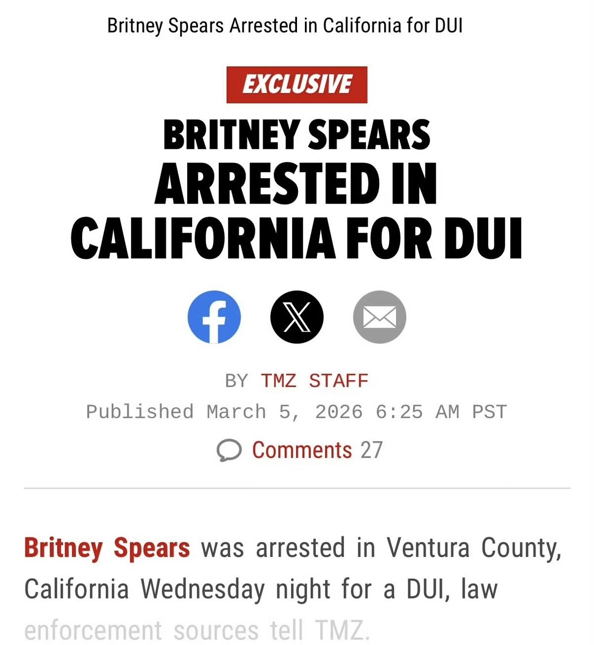 布兰妮,被逮捕! 3月5日深夜,流行天后“小甜甜”布兰妮,连夜冲上了热搜,这次消息十分糟糕,根据外媒报道,布兰妮在加州因涉嫌酒后驾驶被警方逮捕,消息一出立刻引爆全球娱乐热搜。 44岁的“小甜甜”,终究活成了自己曾经最不想成为的样子。 现场画面比想象中更离谱。 被拦停后,布兰妮半点慌乱没有,坐在驾驶座上慢悠悠抽烟,仿佛被拦的不是自己。 但警员一靠近,酒精味直接扑面而来,眼神涣散、神志不清,明眼人都能看出来状态不对。 警员直接判断她是酒精加药物双重影响下驾车,手铐一戴,直接拉走。 据知情人士透露,她在里面哭到崩溃,一个劲给警员道歉,说怕让粉丝失望。 早干嘛去了? 开车前喝酒、碰药物的时候,怎么没想过粉丝,没想过自己的安全,没想过路上其他车主的性命? 好在她没被关太久,清晨6点07分就获释,大概率是态度配合。 但这不是侥幸,是暂时的缓冲,该来的处罚,一点都少不了。 明明有机会摆脱过去的阴影,好好生活,偏要往火坑里跳,不是糊涂,是骨子里的放纵。 布兰妮这些年,嘴上喊着要“重启人生”,行动上却一次次突破底线。 从之前的监护权纠纷,到社交平台上的怪异言行,再到如今的酒驾被捕,哪一次不是在消耗自己的名气和大家的同情? 很多人提起布兰妮,就想到她年少成名被压榨,想到监护权被控制的痛苦,心疼她的遭遇,可心疼不代表可以无视规则。 更关键的是,她不是第一次因为“状态差”引发争议。 过去两年,警方因为各种原因上门14次,邻居报警说她举止怪异,2023年甚至有过在家拿刀跳舞的行为。 这些都不是偶然,而是她长期精神状态不稳定、又不加以约束的表现。 作为一个成年人,尤其是一个有巨大影响力的公众人物,最基本的底线就是管好自己,遵守法律,而不是把自己的情绪失控,变成威胁他人安全的隐患。 有人说,她的两个儿子搬到身边陪伴,能帮她调整状态。 20岁的肖恩和19岁的贾登,或许能给她一些温暖,但没法替她承担酒驾的后果,没法替她出席庭审,更没法替她挽回被消耗的口碑。 布兰妮的问题,从来不是缺陪伴,而是缺自律,缺对规则的敬畏,缺对自己人生的负责。 无论结果如何,有一点是肯定的——布兰妮这次,躲不掉了。 轻则面临罚款、监禁,重则影响余生,而她的口碑,早已被自己一次次的放纵,撕得粉碎。 其实,布兰妮的悲剧,从来不是“童年成名”的锅,而是“自我放任”的果。 她把自己的不幸,当成了放纵的借口,把公众的同情,当成了肆意妄为的资本,最终一步步走向反噬。 从光芒万丈的流行天后,到酒驾被捕的负面人物,她走的每一步,都藏着自己的放纵和不负责。 5月4日的庭审,或许会给她一个教训,但能不能真正醒悟,能不能真正做出改变,全看她自己。 放纵一时,反噬一生,这句话,值得所有公众人物刻在心里。 对于这件事,您有什么想说的吗?欢迎评论区留言讨论。 信息来源: 光明网 2026-3-6 歌手“小甜甜”布兰妮因涉嫌酒驾被捕!经纪人发声:完全不可原谅;社交账号已关闭