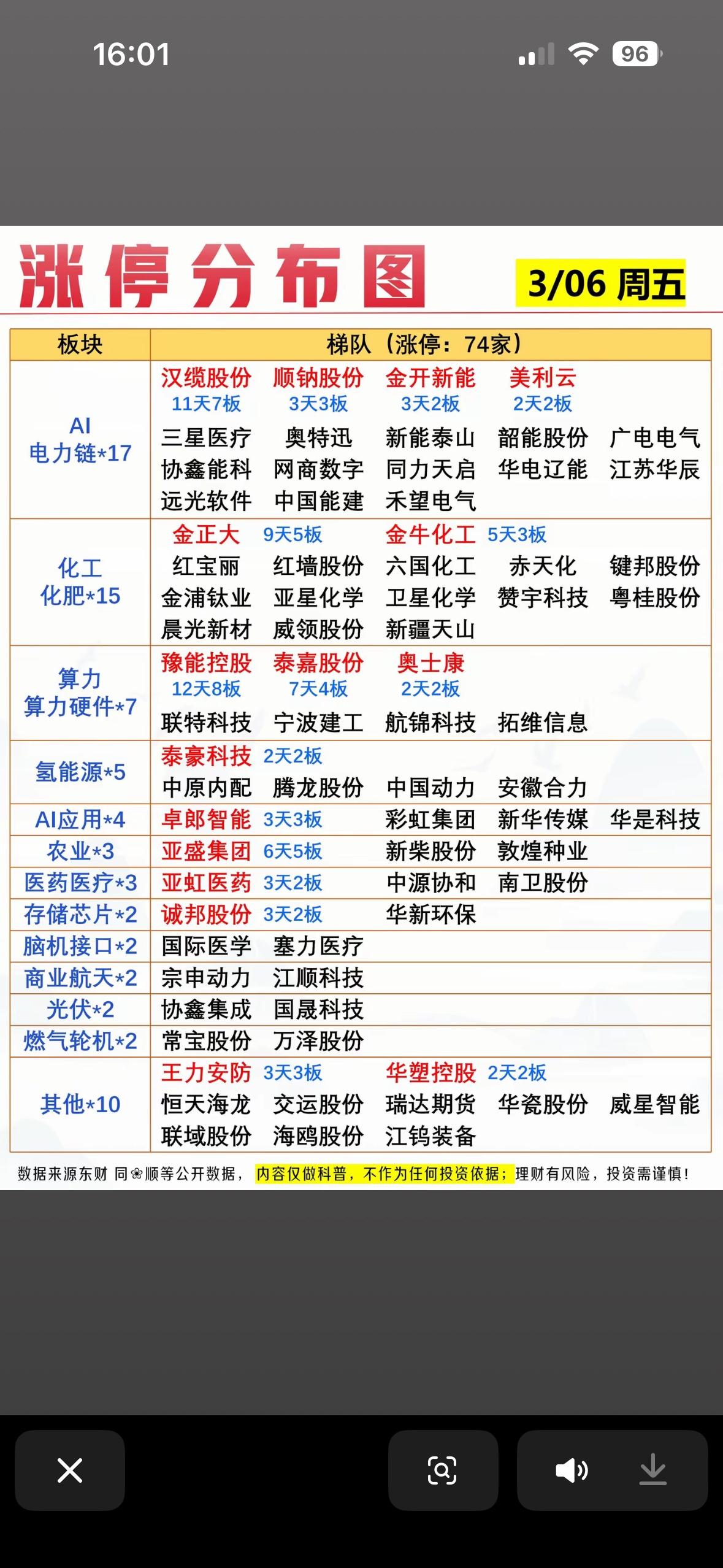 3月6日周五,A股市场热点板块个股分布有不少看点。三大指数集体低开,上证指数跌0.55%,深证成指跌0.52%,创业板指跌0.60%。行业板块里,黑色家电、其他电源设备等上涨,油气开采及服务等领跌,油气股回调明显,洲际油气跌超9%。概念板块中,高压氧舱等涨,可燃冰等跌幅居前。 不过电力方向持续走强,电网设备、虚拟电厂等再度大涨。开盘仅2分钟,新能泰山就直线涨停,广电电气随后也涨停,截至发稿有10多只相关概念股涨停。这得益于近期电网板块利好不断,国家电网“十五五”投资大增,《政府工作报告》也聚焦电力系统建设。