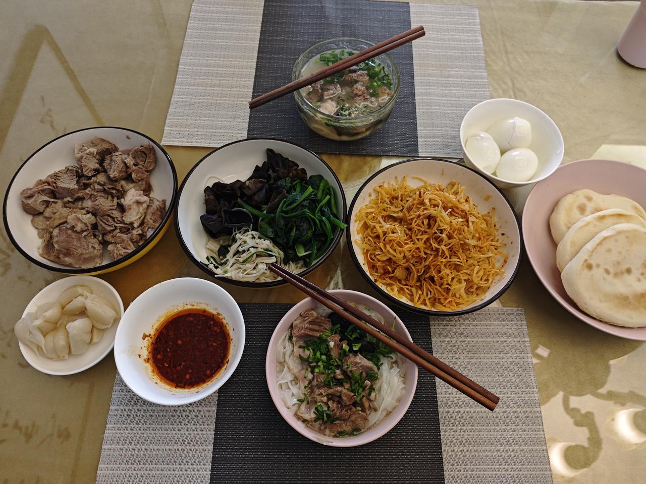 回家后的早餐 这次回来,途中连续的劳累,除了在飞机上吃了三顿飞机餐,一点进食的欲望都没有,昨天早上又要赶早,天还没有大亮,来到小区门外,径直走进了熟悉的这家热米皮店,要了一份热米皮,一个荷叶饼夹肉,看着这碗红油辣子汤汁中软糯光滑的热米皮,理解就口水自缢啊!拿起筷子,慢慢搅动,夹起一条沾满汤汁的热米皮,送入口中,那种舒服又刺激、香辣还软糯的感觉,随着热米皮滑入喉咙而得到了很大的满足,再咬一口荷叶饼夹肉,喝一口汤汁,那就叫一个过瘾啊,真舒服! 昨晚,一下子睡了个天昏地暗,这几天的辛苦和疲惫,一扫而光。起床后,老婆遛狗已经回来了,正在准备早餐,说屋外的风有点大,我就不打算下去了,在屋内练习了两遍八段锦,随后又拉了五十下拉力器,感觉双臂肌肉酸痛,看来久不活动,肌肉的力量明显减弱了! 走进厨房,老婆做的早餐快好了,赶快帮忙当助手,启锅舀汤,端菜递碗,一顿简单的早餐上桌啦! 我们的早餐是一人一碗羊肉粉汤,外加一个鸡蛋,蘸汁羊肉,蘸汁凉菜,一份家乡咸菜,还有刚刚酪好的烧饼。坐下来享受家乡的早餐,感觉真好!