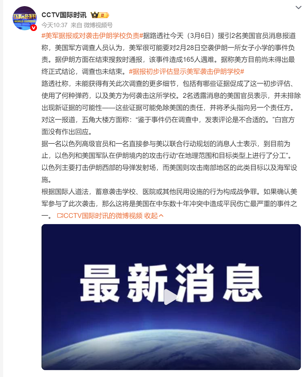 🔻纽约时报和路透社现在都说:据报初步评估显示美军袭击伊朗学校。伊朗称击中美国林肯号航母据报初步评估显示美军袭击伊朗学校海外新鲜事中东现场直击