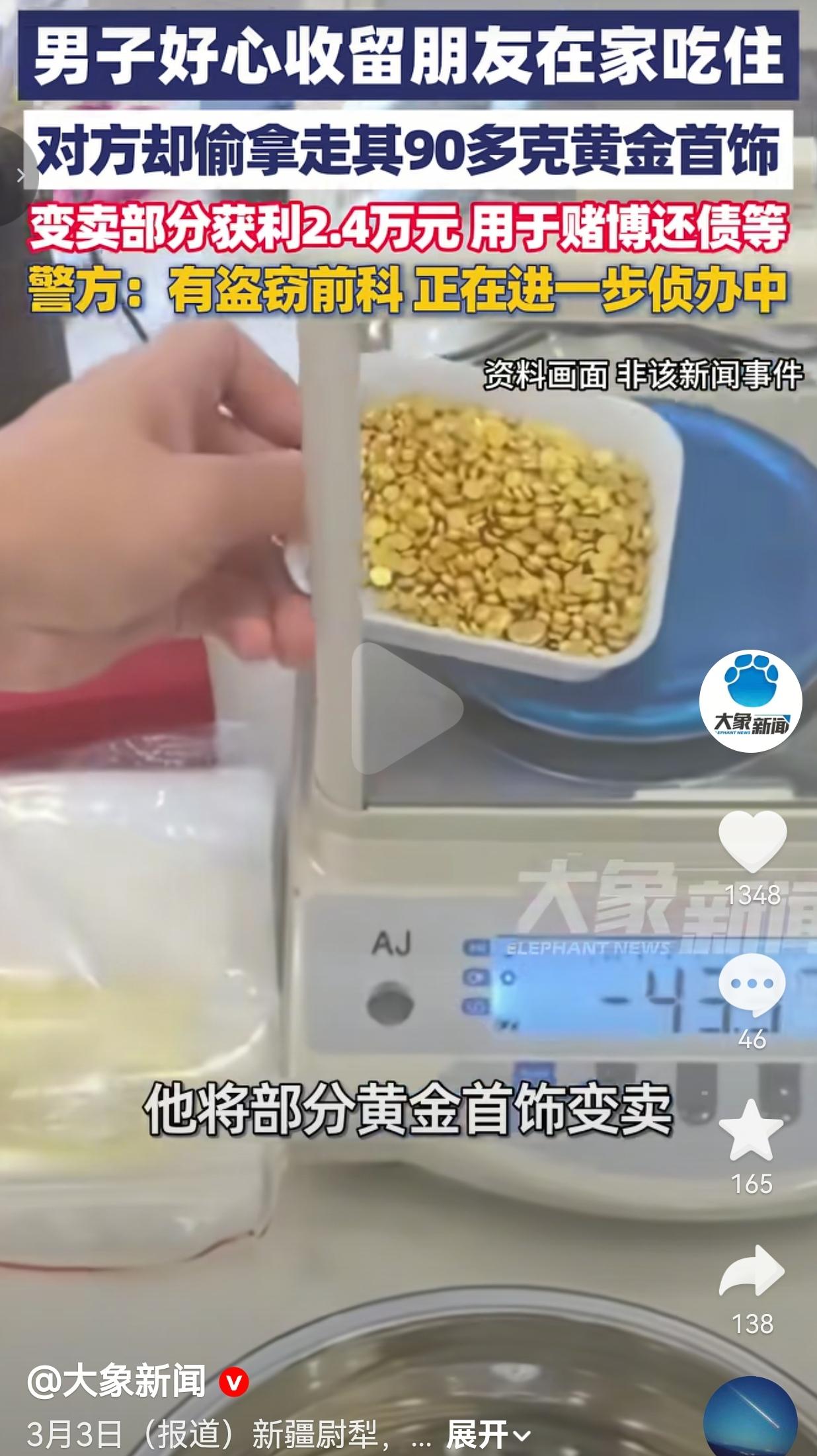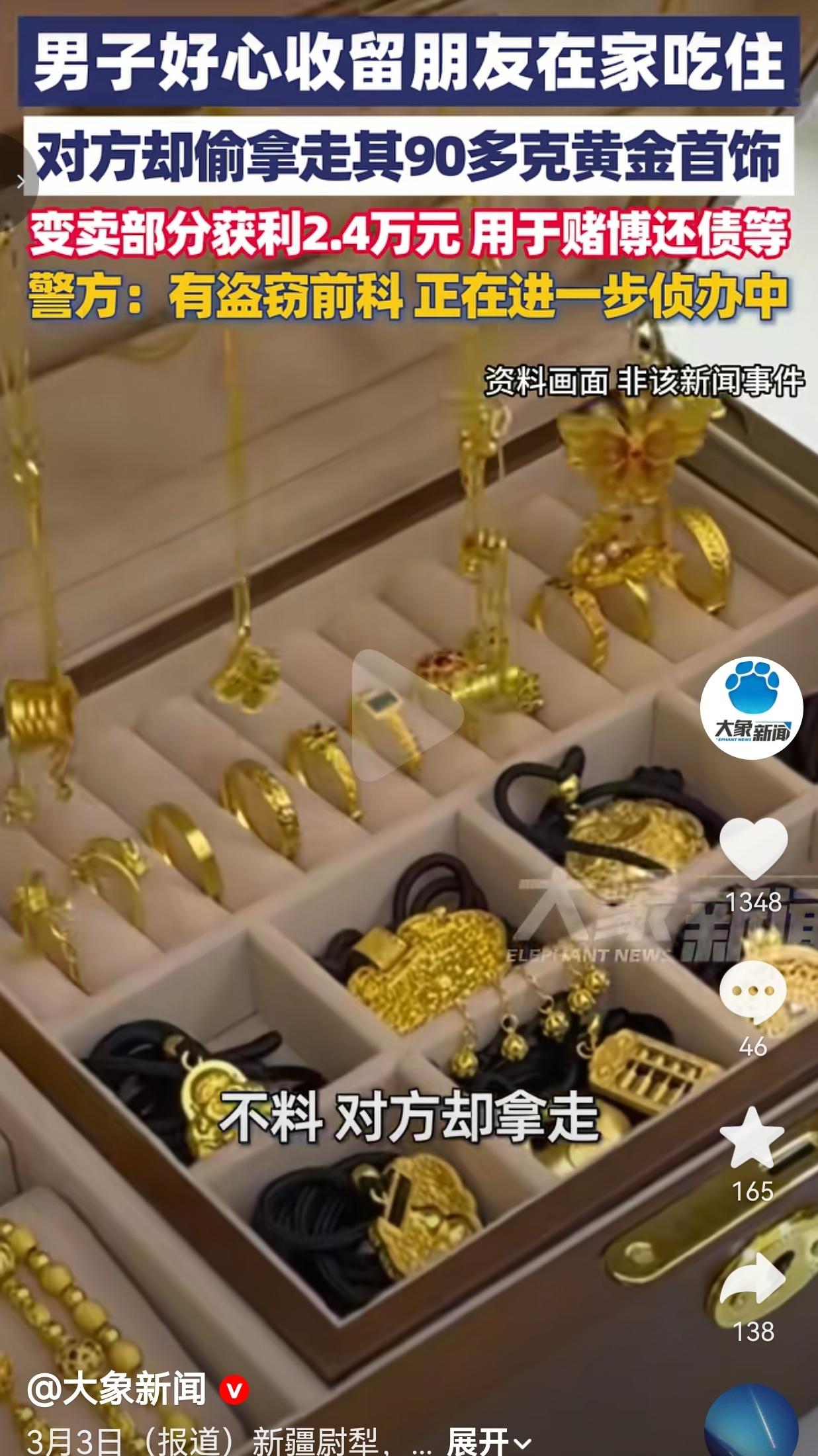别拿你的善良,去赌人性!因为有些人真的没有良心,真的赌不起! 近日,新疆一位大哥,看朋友落难了,于心不忍,让他住家里,管吃管住,拿他当亲兄弟对待。人家有困难,他伸手帮一把,这本来是多实在的好心。 可结果呢? 这位朋友不仅不感恩,还盯上了大哥家里的黄金,一偷就是90多克,卖了两万多块,拿去赌博、还债、挥霍,花得心安理得。 大哥发现黄金没了的时候,整个人都懵了。 他红着眼说:“我真心待他,没想到他偷我家黄金。” 这句话,听着太扎心了。 你掏心掏肺对人好,人家却把你当冤大头;你把人当兄弟,人家把你当提款机。 最让人寒心的是,这个人本来就有盗窃前科,大哥还是选择相信他能改,结果换来的却是一次又一次的背叛。 警察把人抓了,案子是破了,可那份被最信任的人伤害的滋味,多久才能缓过来? 网友看到后评论说:“真的太心寒了!人家管吃管住把你当亲人,你却背后捅刀子,这种人真的不配被善待!” 也有的网友说:“人心换人心,换不来就死心。帮人可以,但真的不能没有底线,尤其是有前科的人。” 还有的网友说:“防人之心不可无,越是熟人越不能放松警惕,伤你最深的往往是最信任的人。” 这件事真的给所有人提了个醒:熟人,不一定可靠。心软,不代表要无底线。 你可以善良,但你的善良必须带点锋芒;你可以选择帮助他人,但别拿自己的生活去赌别人的良心。 因为,不是所有人都配得上你的真心,也不是所有落难的人,都值得你倾尽全力去救。 请一定要记住:帮人之前,先看看人品。信任之前,先守住自己。别等到被伤透了才明白: 人心换人心,换不来就转身。 针对此事,你有什么看法呢?欢迎大家评论区讨论留言。