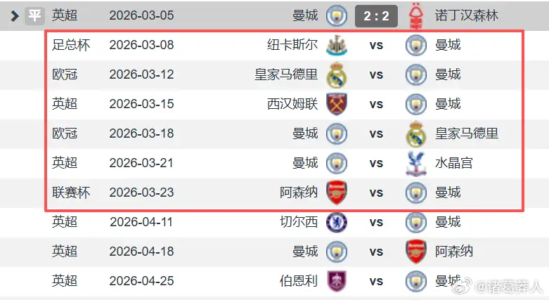 曼城2-2森林后还有16天5赛 3连客纽卡皇马铁锤帮+战枪手争联赛杯英超第29轮,阿森纳没有掉链子,客场1-0小胜布莱顿全取三分。曼城主场两度领先两度被扳平,2-2战平诺丁汉森林,错失追分良机。阿森纳多赛一场领先7分,曼城争冠彻底陷入绝境。接下来曼城将迎来魔鬼赛程,16天5赛全是强强对话,三连客对阵纽卡、皇马、西汉姆,之后再战皇马与阿森纳,赛程堪称地狱模式。个人认为,曼城本赛季联赛发挥不稳,英超争冠基本出局,只能全力冲击杯赛。必须拿到至少一冠,否则瓜迪奥拉连续两赛季四大皆空,实在难堪!足球