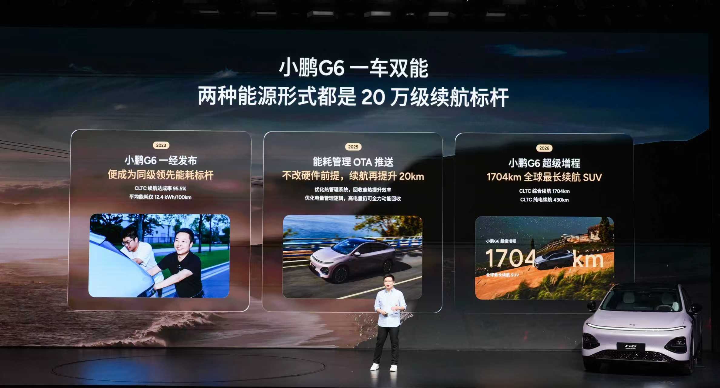一车双能,小鹏G6超级增程1704km全球最长续航SUV 来了!【同级最长】CLTC综合续航 1704km【同级最长】CLTC纯电续航 430km“55.8kWh大电池+60L大油箱”小鹏G6,20万级续航标杆。新SUV续航纪录平时就是电车,出远门才是油车小鹏G6超级增程六项全能一步到位