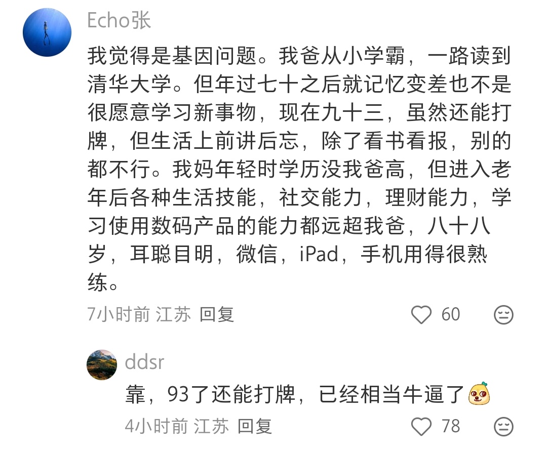 哈哈哈第一个评论人家年轻时候的智商180,老了哪怕扣60都比一般人聪明