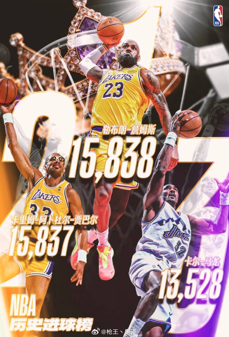 詹姆斯生涯进球数历史第一 勒布朗·詹姆斯在今日湖人对阵掘金的比赛中,依靠一记翻身跳投命中,投中第15838颗运动战进球,超越贾巴尔独占历史第一!