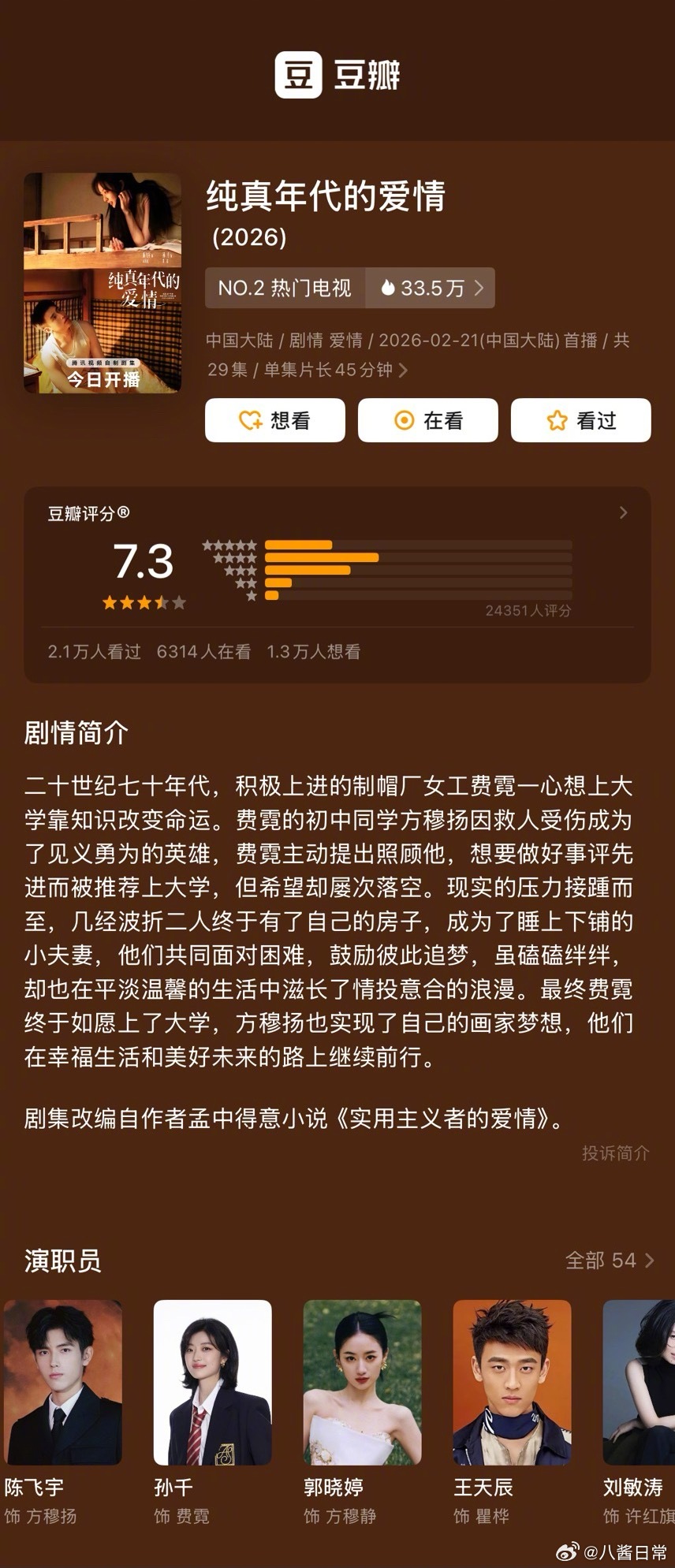 两部年代剧开分陈飞宇、孙千《纯真年代的爱情》豆瓣开分7.3分黄景瑜、关晓彤《岁月
