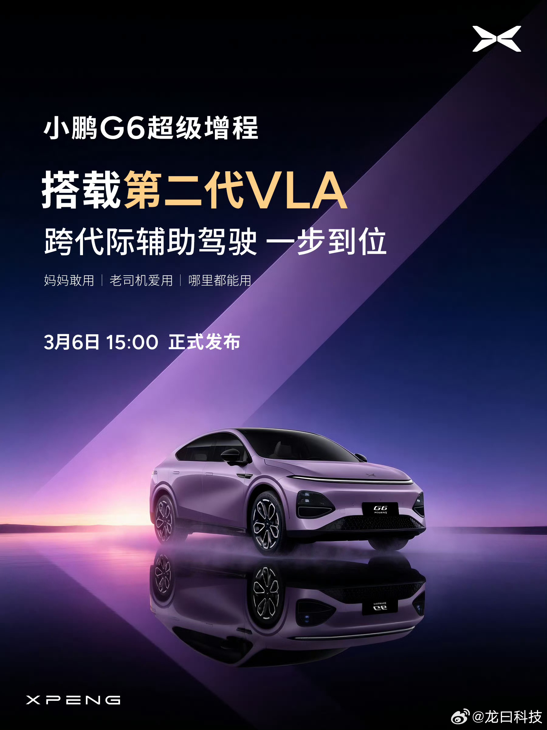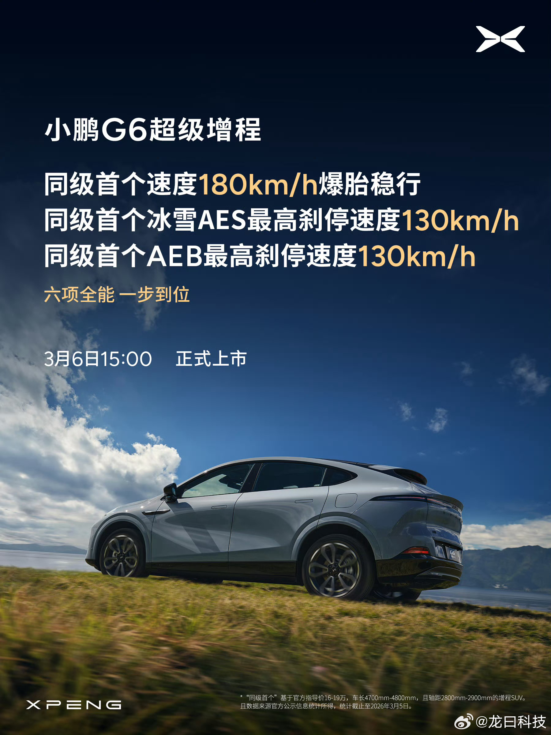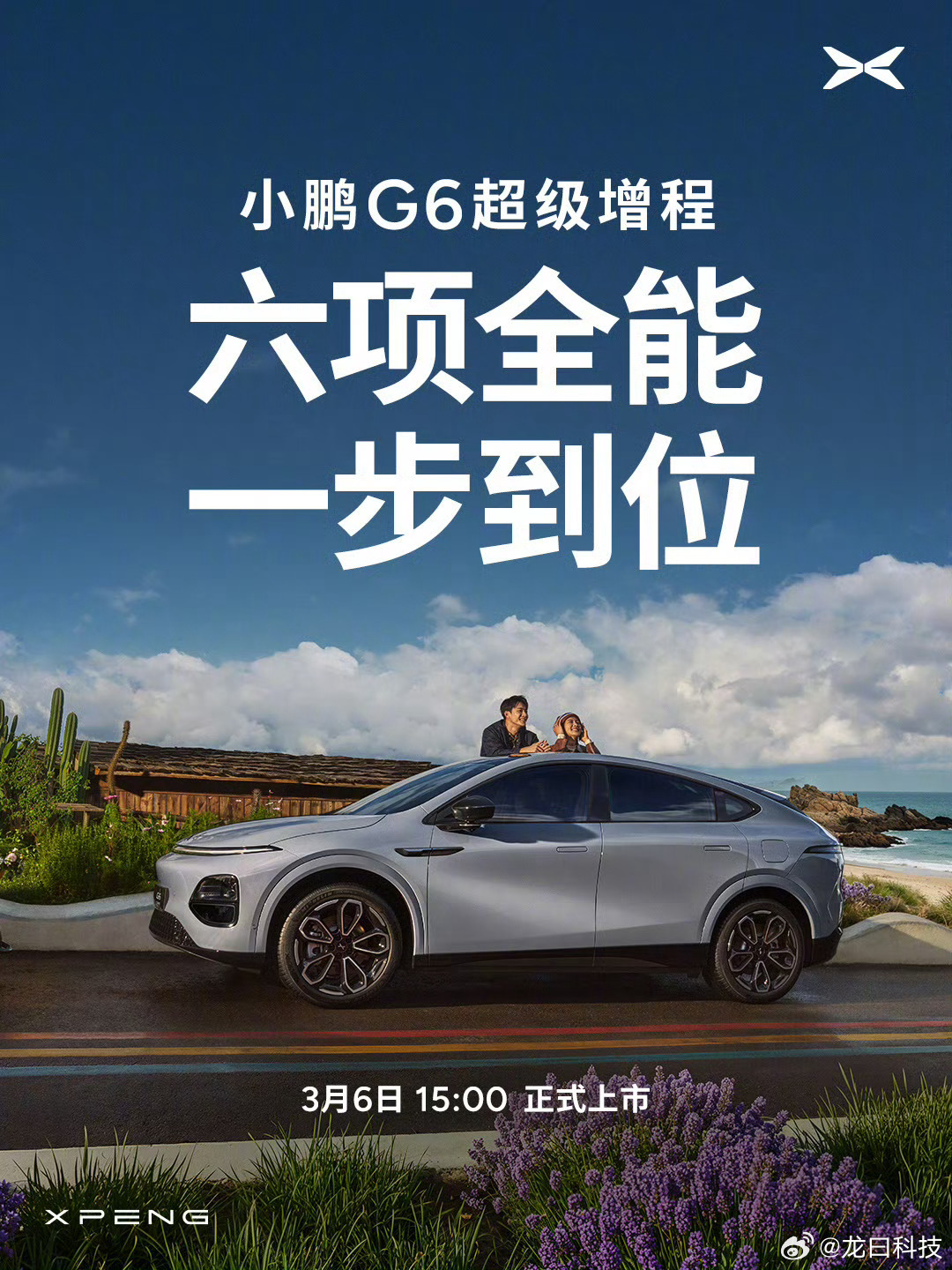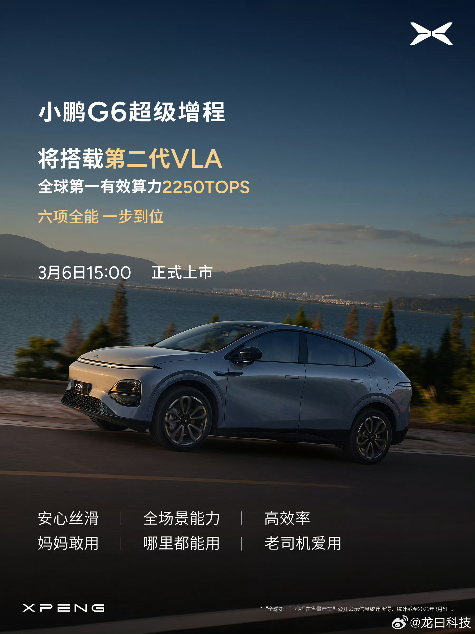 小鹏G6超级增程六项全能一步到位小鹏G6超级增程今天下午正式上市了,官方给的定义是“六项全能”。续航上,CLTC综合1704公里,纯电430公里。智驾直接给了2250TOPS算力,搭第二代VLA大模型。充电用800V+5C平台,12分钟补314公里。空间得房率85.6%,头部超1米。安全上支持180km/h爆胎稳行、130km/h AEB刹停。底盘标配太极AI加DCC。官方说是“六项全能”,算是把短板全补上了。
