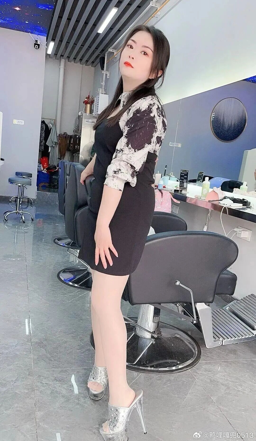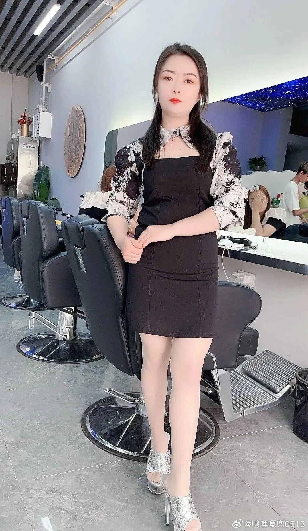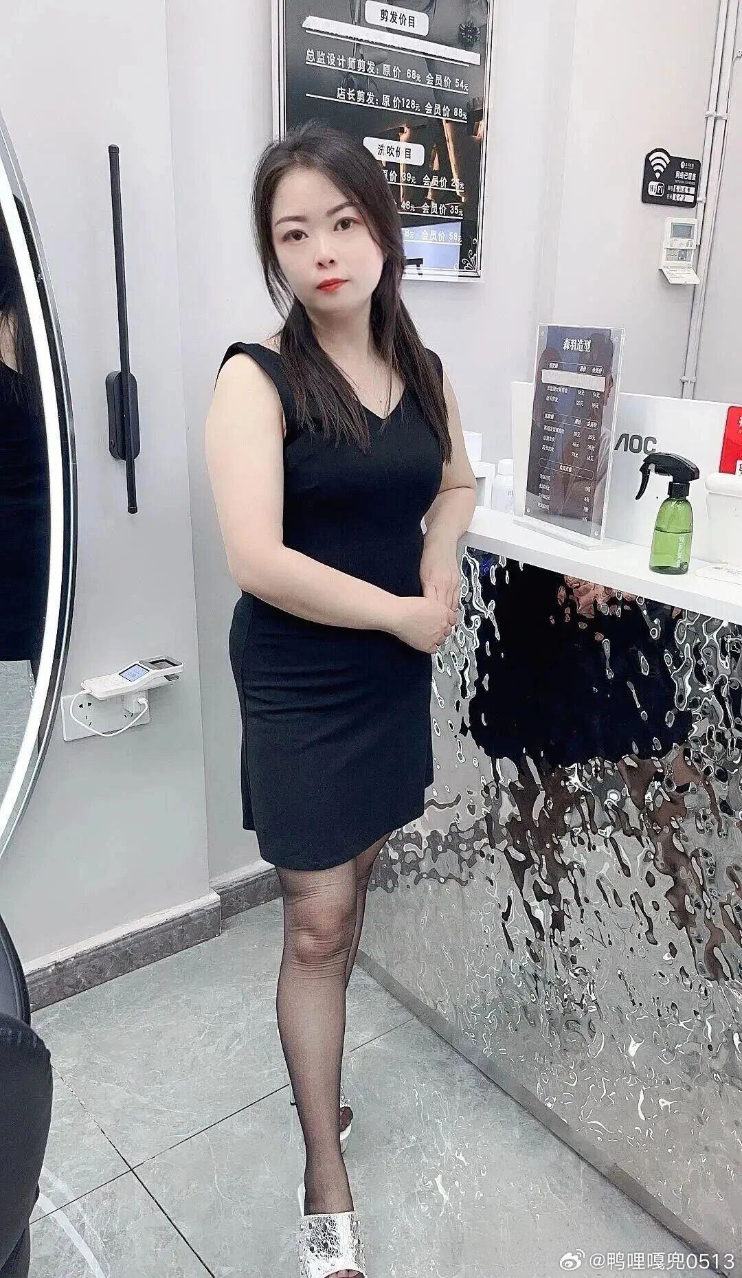 写真 理发店老板娘一身黑色吊带连衣裙真好看