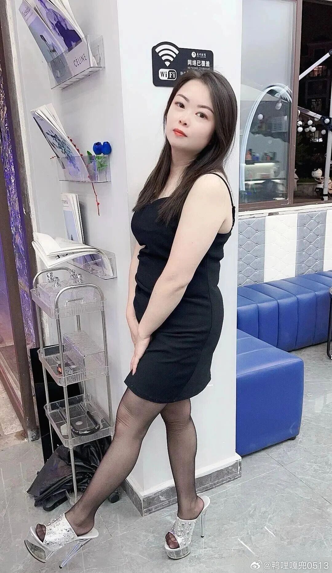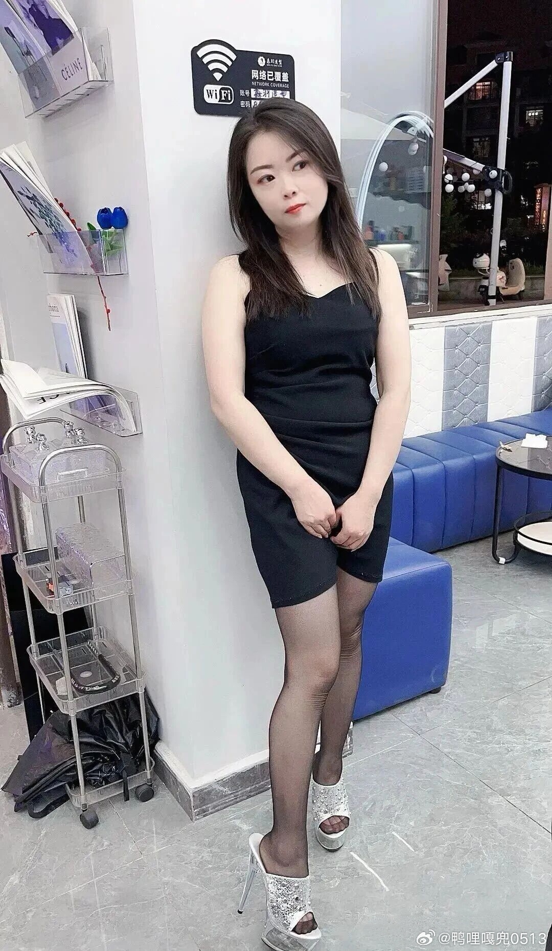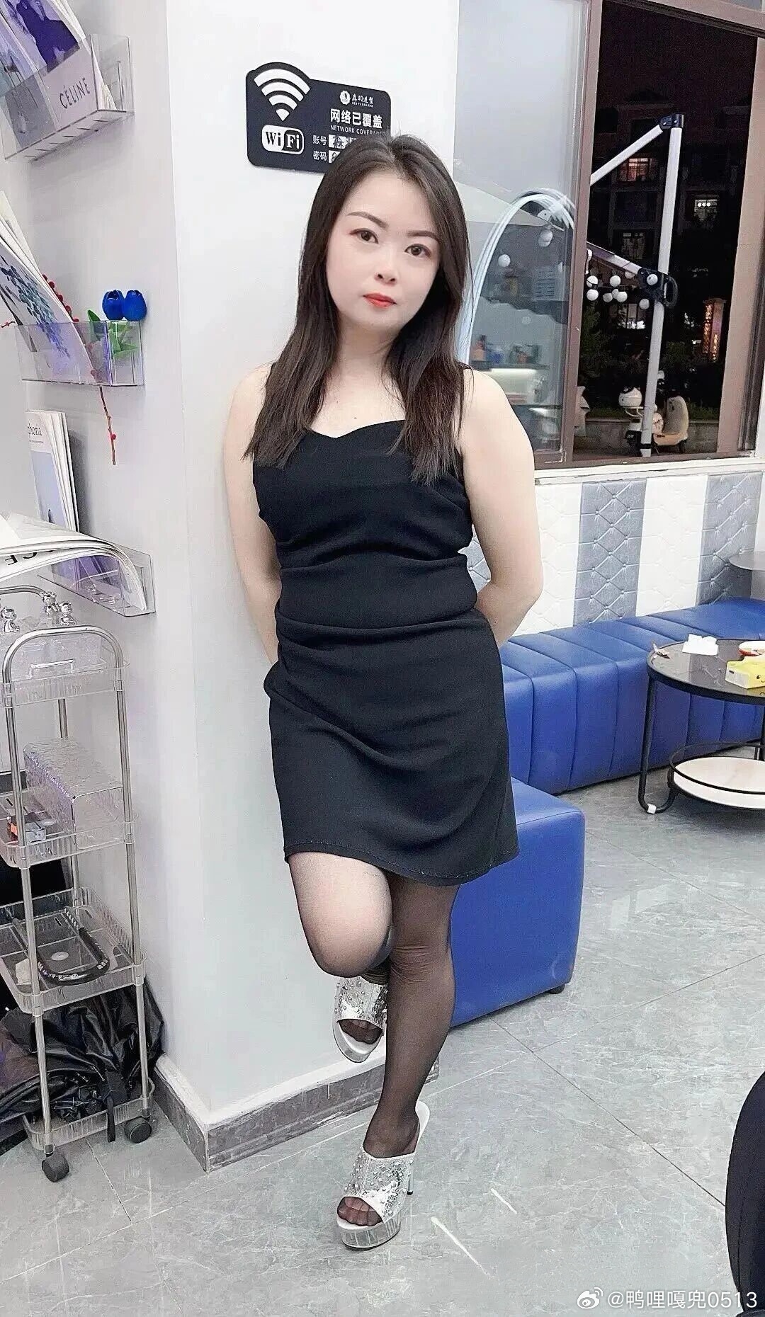 写真 理发店老板娘一身黑色吊带连衣裙真好看