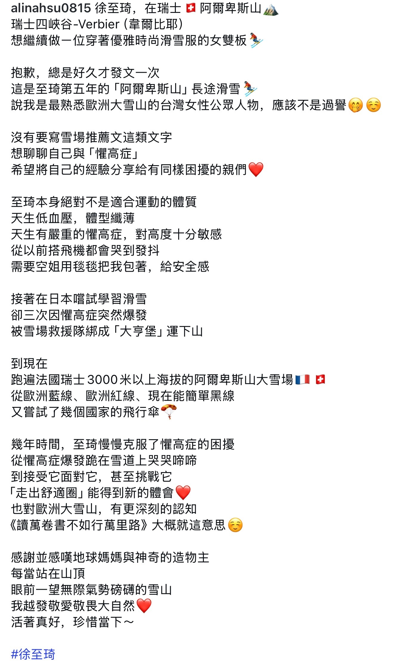 徐至琦女士又在阿尔卑斯山发动态了,这次的文案依旧是熟悉的配方: