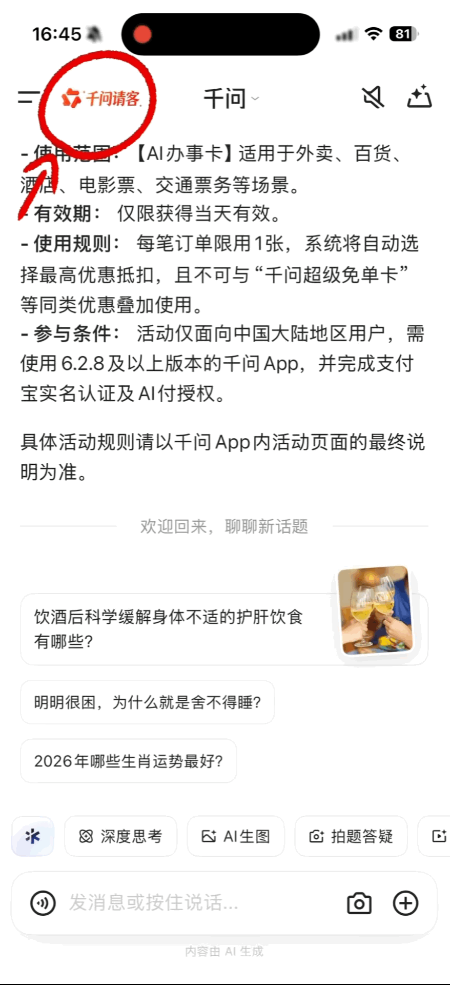 首页【千问请客】-【AI办事卡】领取即可