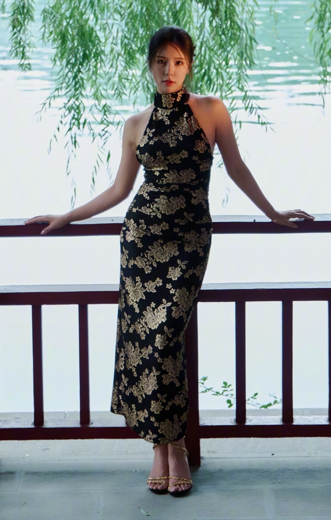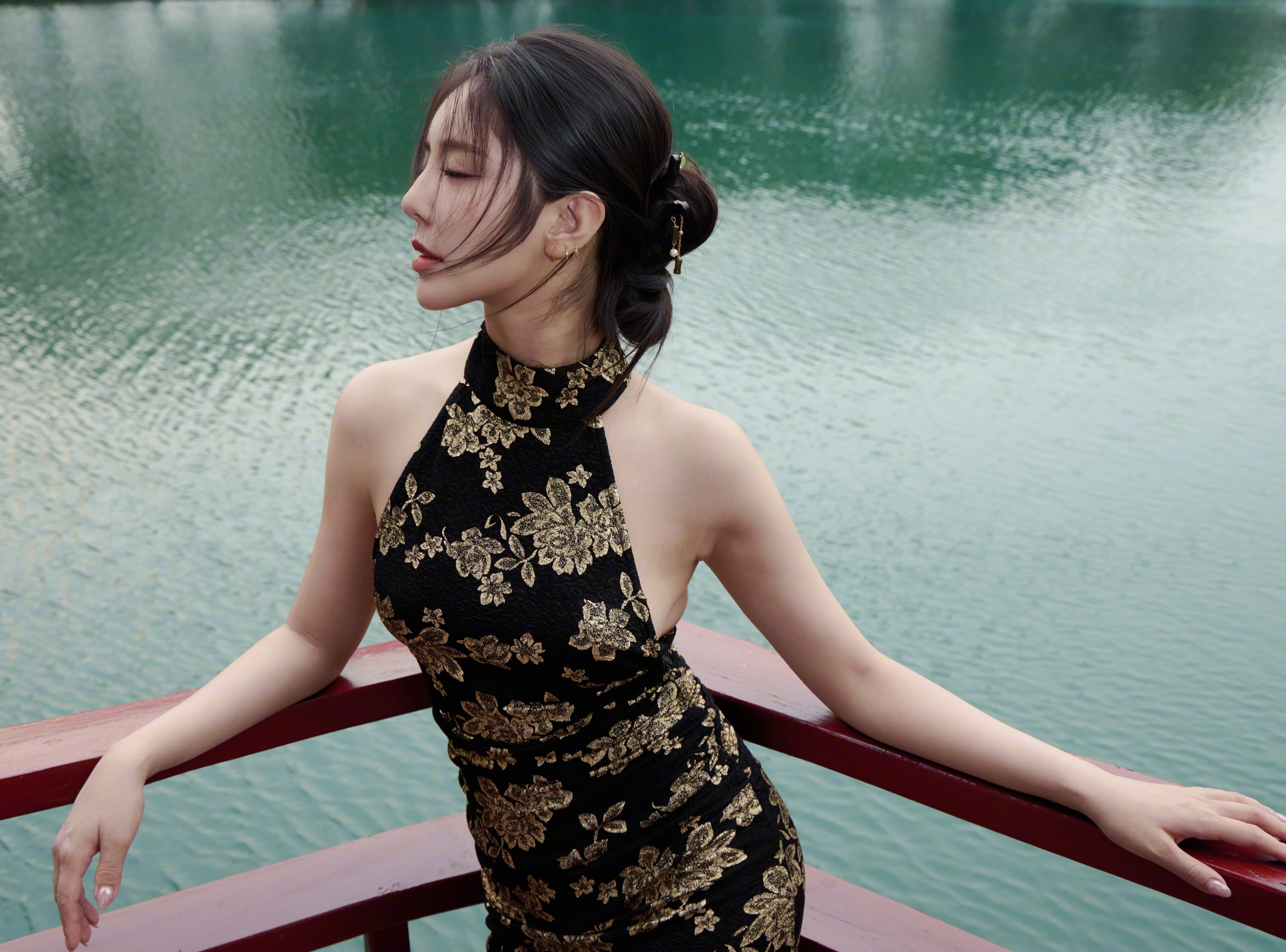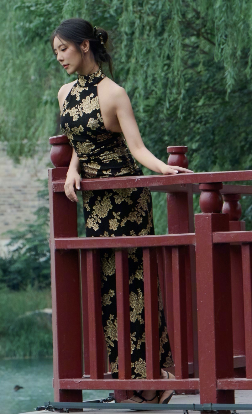赵奕欢赵奕欢黑金刺绣挂脖露背包臀裙搭配金色一字绑带细高跟