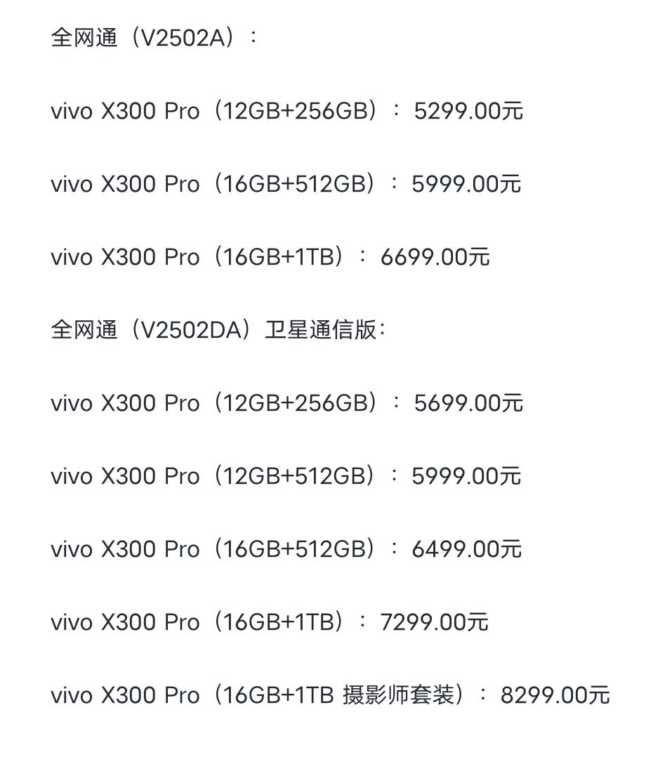 vivo X300 Pro全系新增卫星通信版,比普通版贵500块钱左右 12+256GB 5699 12+512GB 5999 16+512GB 6499 16+1TB 7299