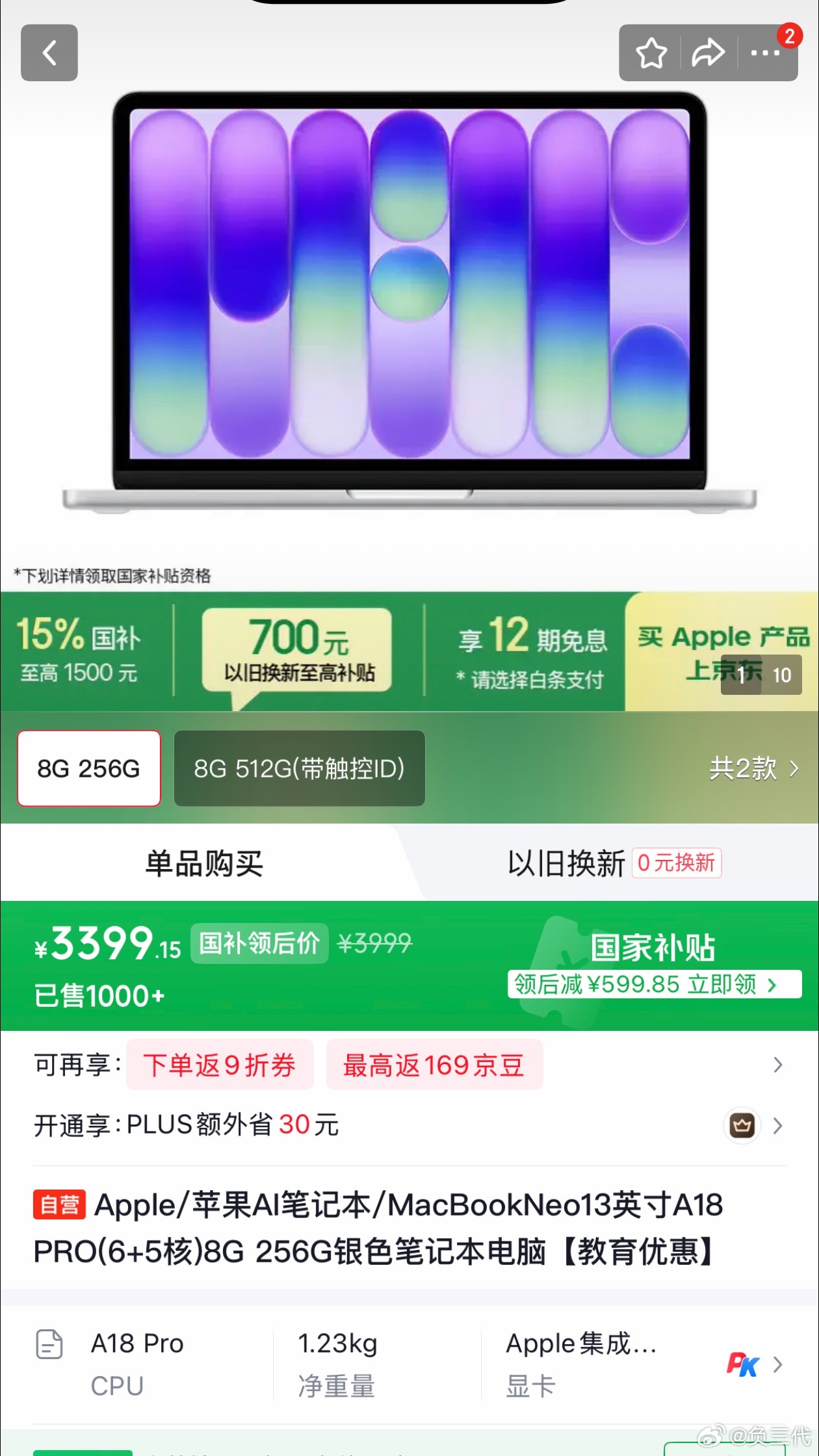 MacBookNeo叠加教育优惠和国补后,价格只有3399,大学生买一台平时学
