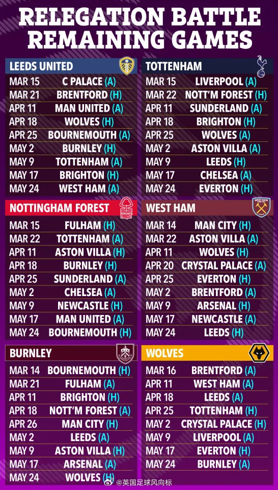 【一图看懂:英超保级球队赛程对比】6支陷入保级战的英超球队,本赛季剩余赛程对比。伯恩利和狼队已经保级无望,剩下的4支球队,你觉得哪支的赛程最艰苦呢?英超联赛