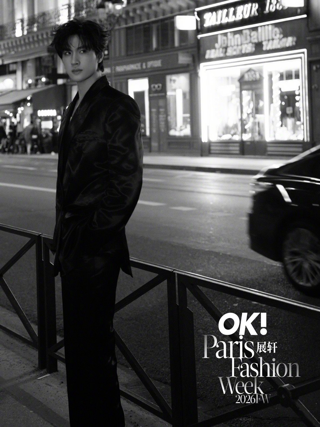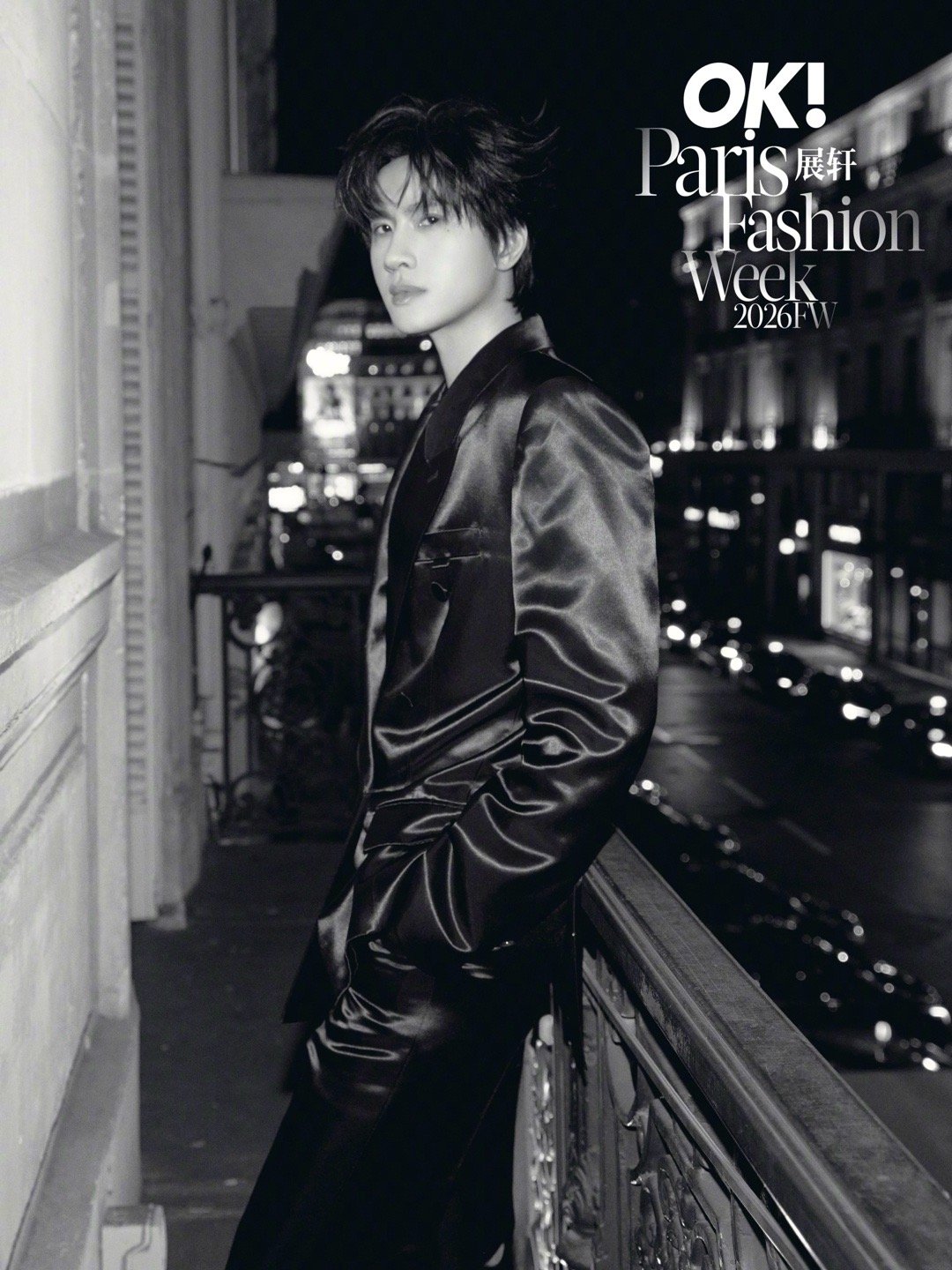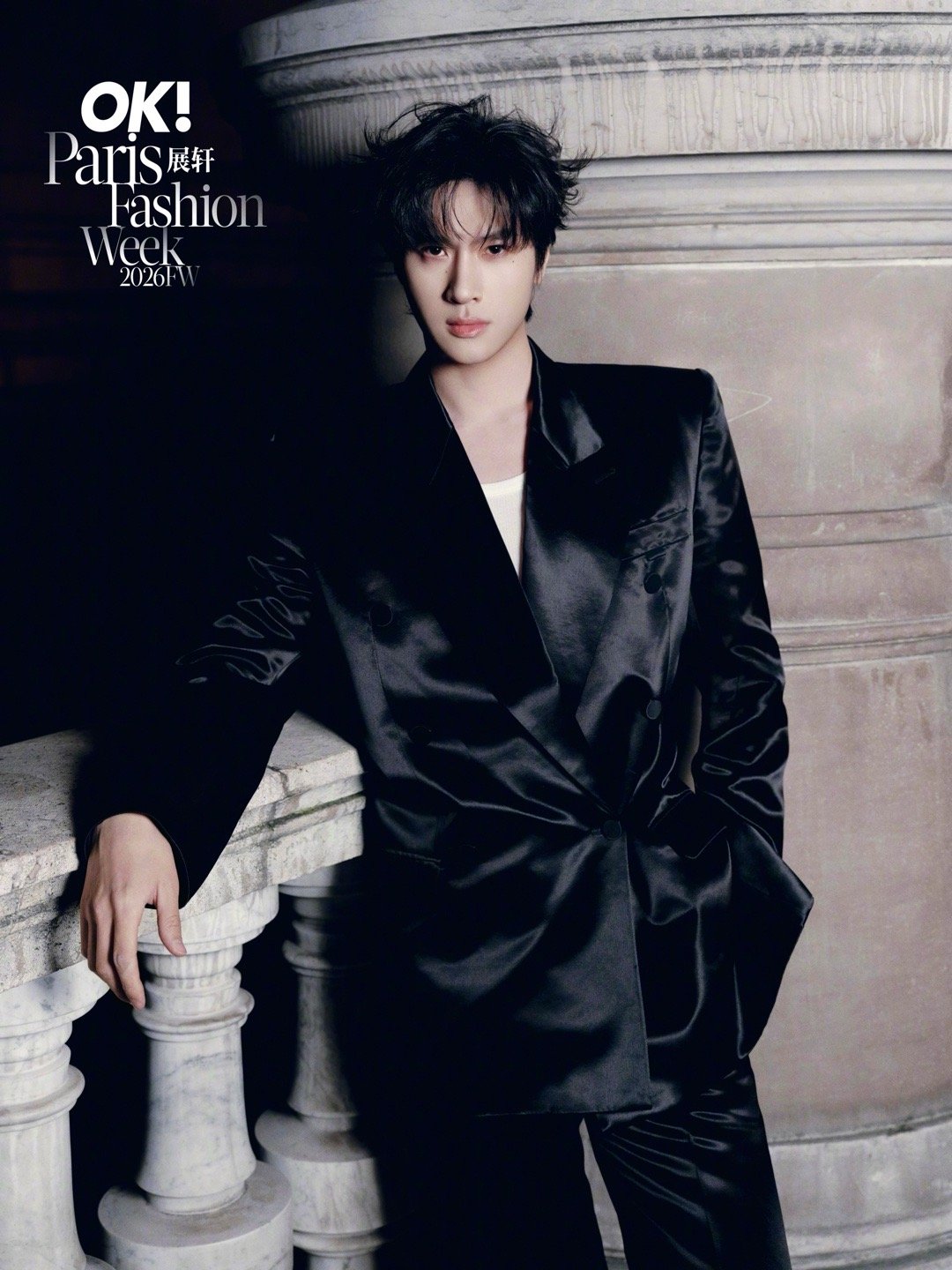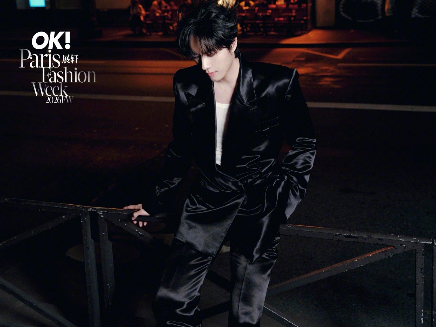 展轩 × 巴黎时装周 第三站Look,受邀亮相MUGLER 2026秋冬大秀,身穿品牌2026早春系列出镜,缎面裁剪西服套装在夜色下闪耀流动光影,以先锋未来感迈入本季时装周最终站,型男即将登场✨