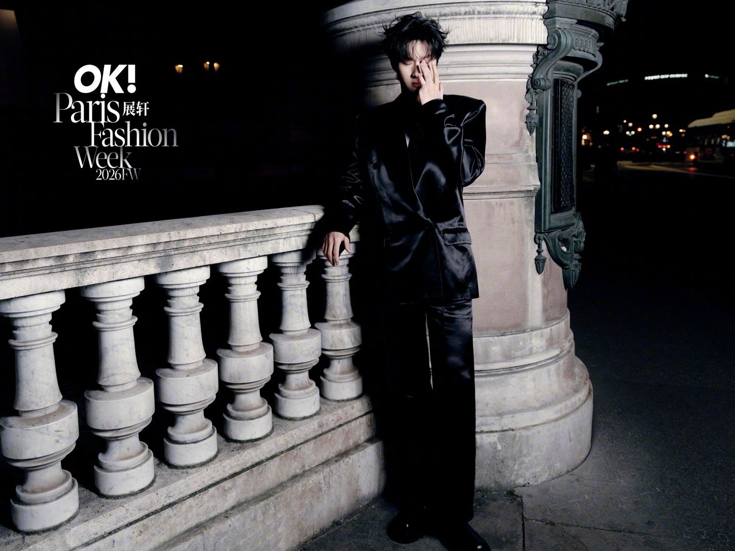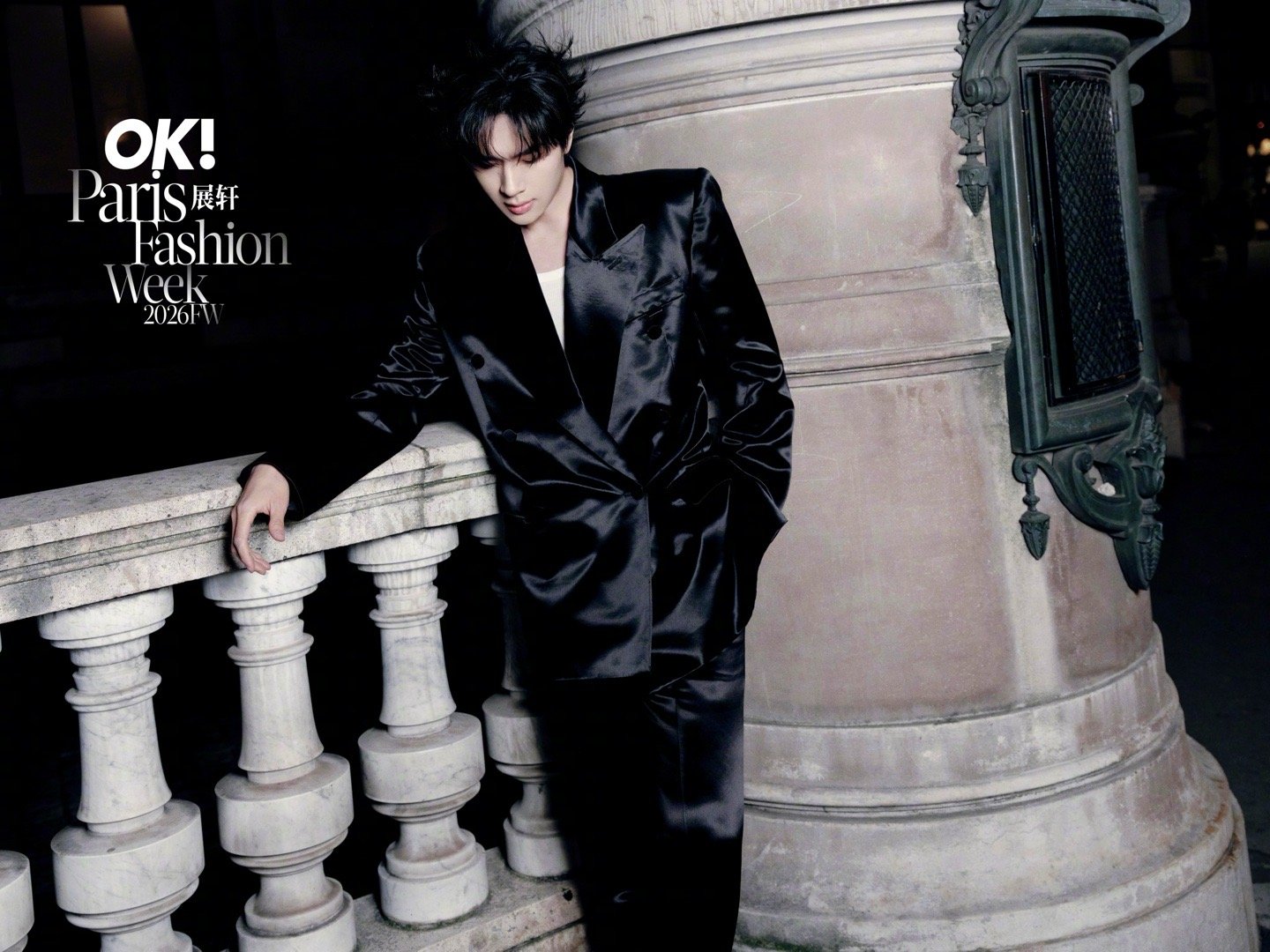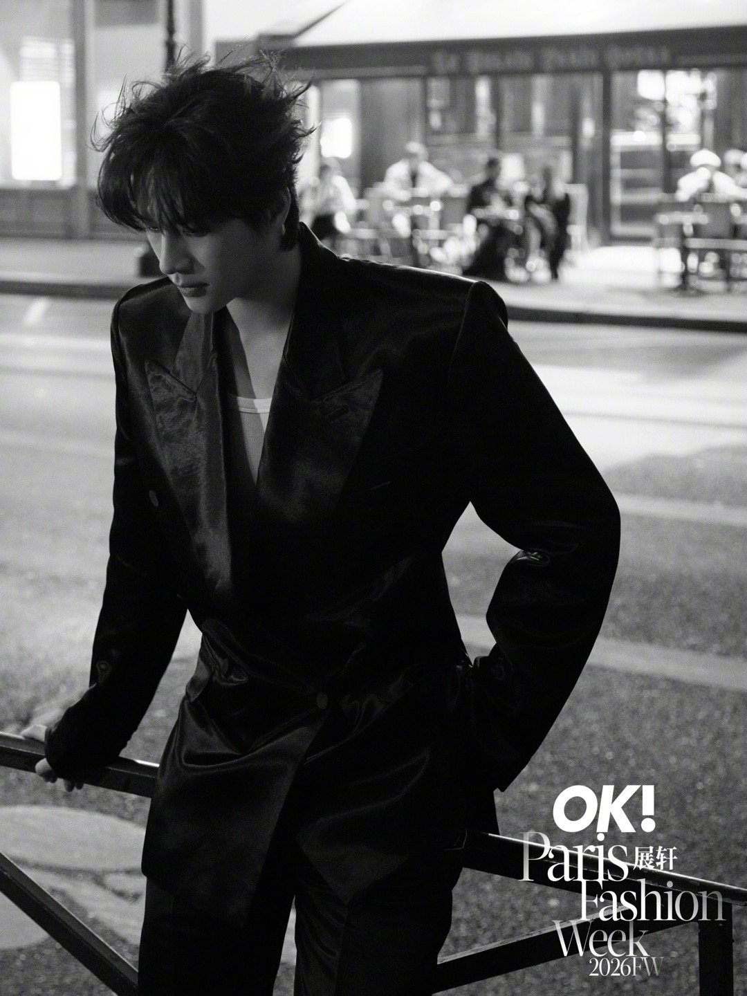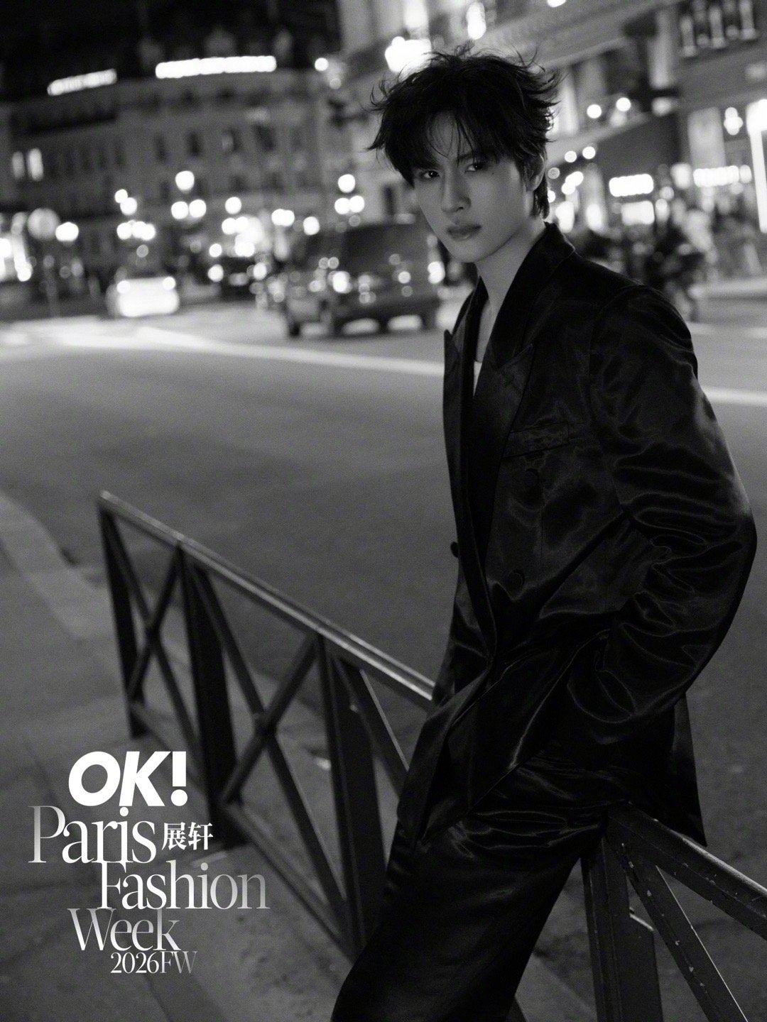 展轩 × 巴黎时装周 第三站Look,受邀亮相MUGLER 2026秋冬大秀,身穿品牌2026早春系列出镜,缎面裁剪西服套装在夜色下闪耀流动光影,以先锋未来感迈入本季时装周最终站,型男即将登场✨