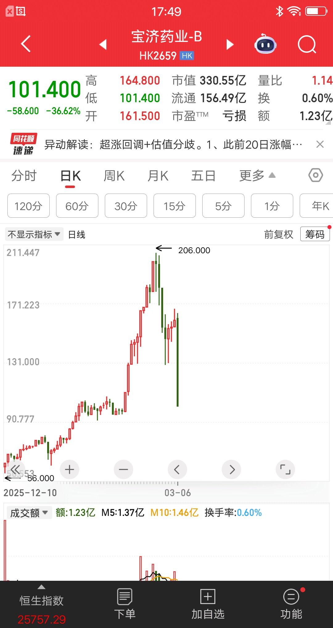 港股今天最惨的票诞生了,跌幅榜第一位,开盘就买的人,收盘一看亏麻了。该票从头跌到尾,持续性走低,中间每一次拉升都是诱多。后面干脆不装了,直接跳水杀跌,收盘跌幅36%。 大跌的原因并不是有利空,而是因为涨太多了。上市以来收获了6.5倍的涨幅,简直屌爆了。然而物极必反,有牛市就有熊市。短短8个交易日,股价高位腰斩,太狠了。 好在港股没有散户,不然账户几天腰斩,还有勇气活下去吗? 公司是一家临床与商业化阶段的重组生物药公司,核心是用合成生物技术开发、生产、商业化重组蛋白与抗体药物,替代传统生化提取药、升级现有疗法 。