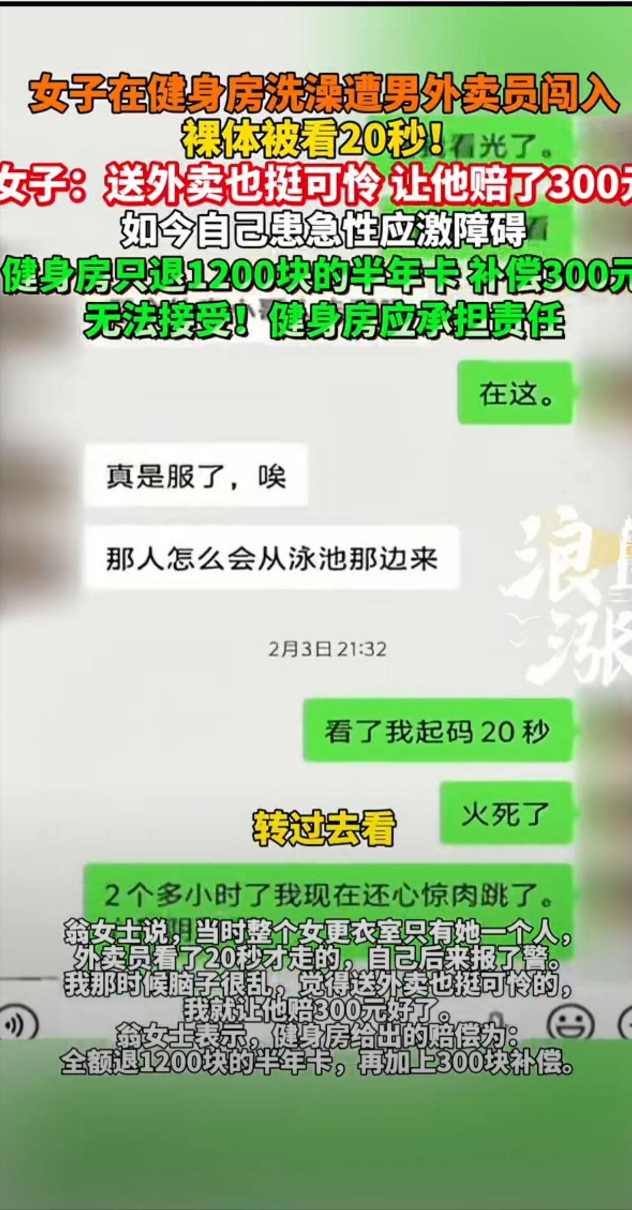 浙江嘉兴,一女子健身完去洗澡时,却被误闯进来的外卖员看光了身体。女子念及外卖员生活不易,心一软,便只让对方赔偿了300元了事。然而事后,女子想让健身房再承担责任,健身房却只肯退卡,另外再赔偿300元,这让女子无论如何都难以接受。 说实话,看完这个事我是真憋不住了。2025年2月4日傍晚,浙江嘉兴一家健身房,翁女士刚练完操课,晚上7点刚过,她走进空无一人的淋浴区。这种清静本来就是她当初花1200块办年卡的理由之一——谁能想到,这份清静会以这么荒唐的方式被打破。 衣服刚脱,花洒还没开,那个蓝灰色的门帘就被人猛地掀开了。一个拎着盒饭的外卖员,就这么大摇大摆地闯进了这片本该严防死守的女性禁地。 监控画面把这一切都拍得清清楚楚。整整20秒!你知道20秒有多长吗?足够让一个女人从震惊到羞愤,再到本能地尖叫出声。直到翁女士崩溃地呵斥,那个男人才慌慌张张地退了出去,嘴里还嘟囔着"走错了"。 这20秒,后来在法律和道德的天平上被反复掂量,最后竟然被折算成了一个极其廉价的数字。 事发后,翁女士坐在派出所里,看着对面那个"风里来雨里去"的打工人。民警调了监控,定性为"无心之举"。那一刻,她心生怜悯,恻隐之情涌上心头。念及对方谋生之艰,她选择了宽容。最终,让对方赔偿300块,并签订了和解书。她以为这事就算翻篇了。 可回到家,她发现自己开始对任何风吹草动都产生剧烈反应。去医院一查,急性应激障碍。那消失的20秒,正在她身体里反复横冲直撞。 闺蜜一句话点醒了她:外卖员或许是无心的,但健身房绝对是失职的!一个本该重兵把守的女性隐私核心区,为什么没有门禁?为什么没有醒目的警示标识?为什么在长达20秒的时间里,没有一个工作人员察觉到异性闯入? 当翁女士重新找到健身房老板讨说法时,对方给出的"诚意"精准得近乎冷血:退还1200元年卡费,再额外补偿300元。 你没看错,又是300元!这个数字简直就是对翁女士善意的赤裸裸嘲讽。健身房的逻辑简单得令人发指:既然你认为外卖员的侵犯只值300块,那我们也照方抓药,给你300块买个清静。 他们将《民法典》第1198条所规定的“安全保障义务”,肆意缩减,使之沦为一场如菜市场般充斥着锱铢必较的讨价还价闹剧。他们打的算盘响得很:一个连外卖员都舍不得重罚的善良女人,大概也不会为了所谓的隐私权和精神创伤,去耗费精力打一场旷日持久的官司。 截止到今天,2026年3月4日,这场关于20秒隐私权的博弈依然处于僵局。翁女士还陷在那场急性应激障碍的余震里,而健身房依然死死攥着那份"退卡+300"的方案不撒手。 这种反差极其刺痛人心:当一个人选择弯下腰去体谅弱者的艰难时,那些收了她钱、承诺保护她的人,却正借着她的温柔,精准地计算着逃避责任的最低成本。 说白了,这早就不是300块还是1500块的问题了。如果经营者能靠着这种"廉价和解"敷衍过关,那么每一个女性健身后的更衣室,都将沦为一个随时可能被"无心之举"掀开帘子的公共走廊。 当善良被当成了讨价还价的筹码,剩下的就只有法庭见了。正如翁女士所言,既然道理讲不通,那就只能让法律来量一量,那惊恐的20秒,到底值多少公道。 别以为这只是一个女人的遭遇。今天健身房能用300块打发一个受害者,明天就能用同样的套路对付更多人。这种把安全保障义务当儿戏的经营者,必须付出代价!