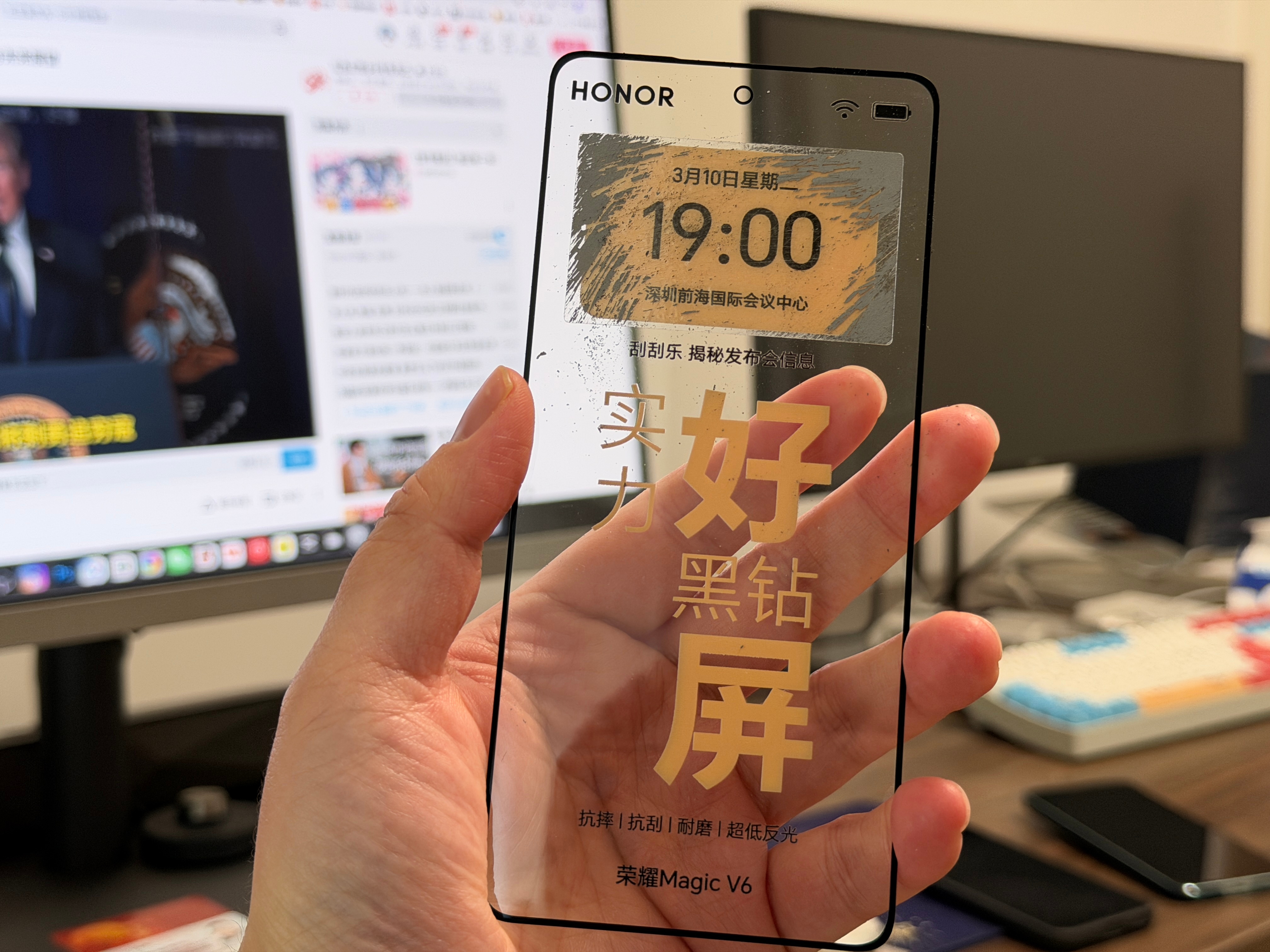 收到荣耀Magic V6邀请函是一块屏幕,还带了块砂纸至臻黑钻屏,抗摔抗刮抗磨超低反光3.10日晚上19点发布会,期待折叠屏最好的屏幕长什么样