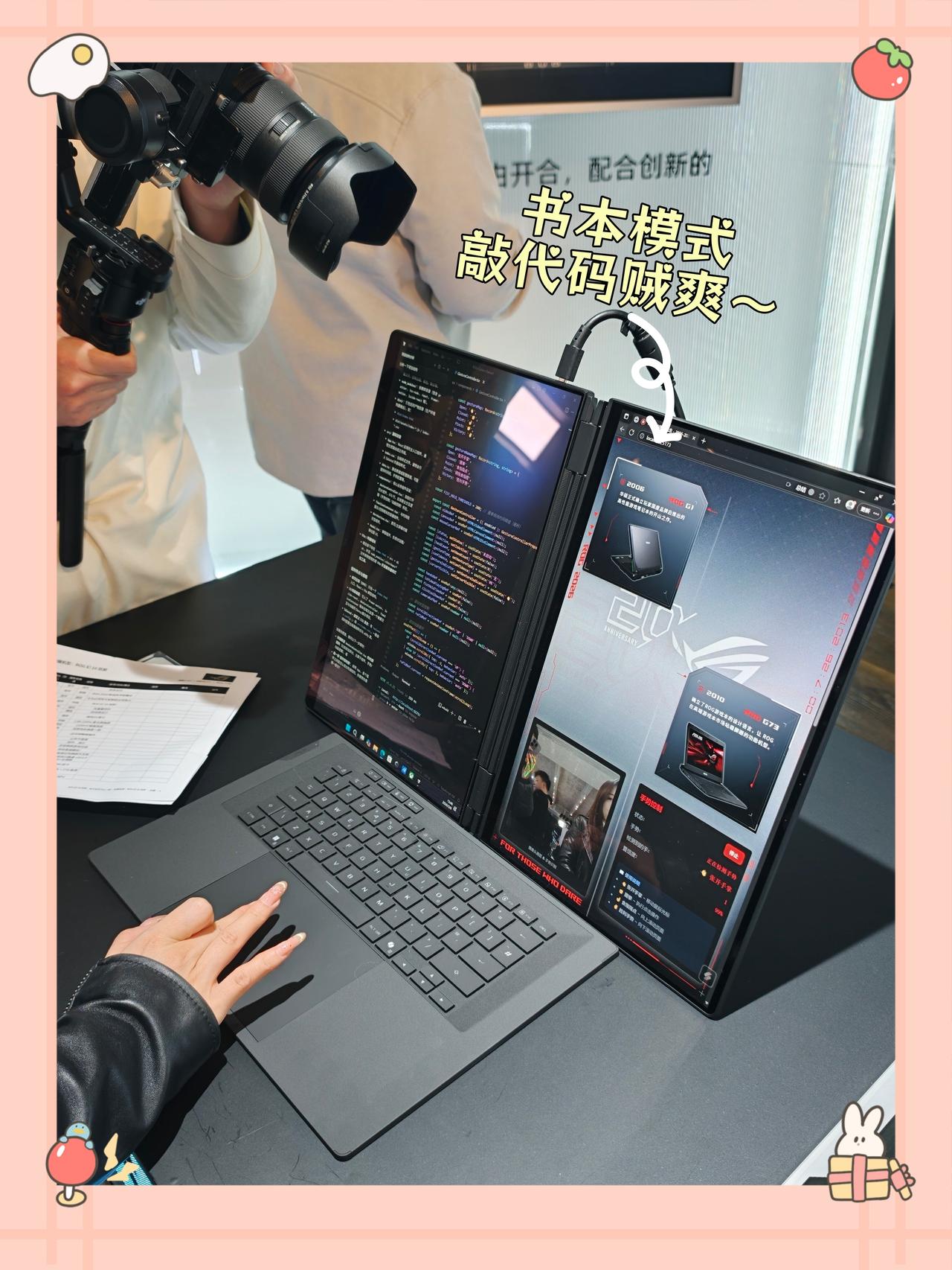 用这个电脑写代码,颈椎病都能治好了吧🤣 买这个电脑来编程,是不是太奢侈了? 这两天被ROG幻16双屏狠狠种草了🌿 两块16寸2.8K OLED屏竖着叠起来 直接变成💻21寸纵向巨幕 现场还模拟了下编程场景 左屏写代码、右屏跑调试/查文档 这样一来,就不用在单个屏幕上反复切tab了 思路完全不打断,效率党狂喜 作为天天敲代码的打工人,终于找到本命生产力本! 我只能说幻16双屏这个书本模式是真实用 炒股可以多屏看盘、剪视频可以一边剪辑一边预览 ♥️用起来估计能爽到飞起吧? 而且它有笔记本/双屏/分享/帐篷/书本五大形态 随便切换适配所有场景👍 日常用笔记本模式,开会用分享模式 追剧开帐篷模式,一台顶好几台 关键是两块16英寸星云原画屏素质拉满 2.8K高刷+高色准,长时间看屏也不费眼 🎮性能也够猛,Ultra 9处理器+RTX 50显卡 跑代码、玩3a、多开任务都能丝滑不卡吧 👀说真的,这是把双屏工作站塞进包里了 ROG搞出这玩意,属实有点东西💡 这才是真·全能生产力神器!