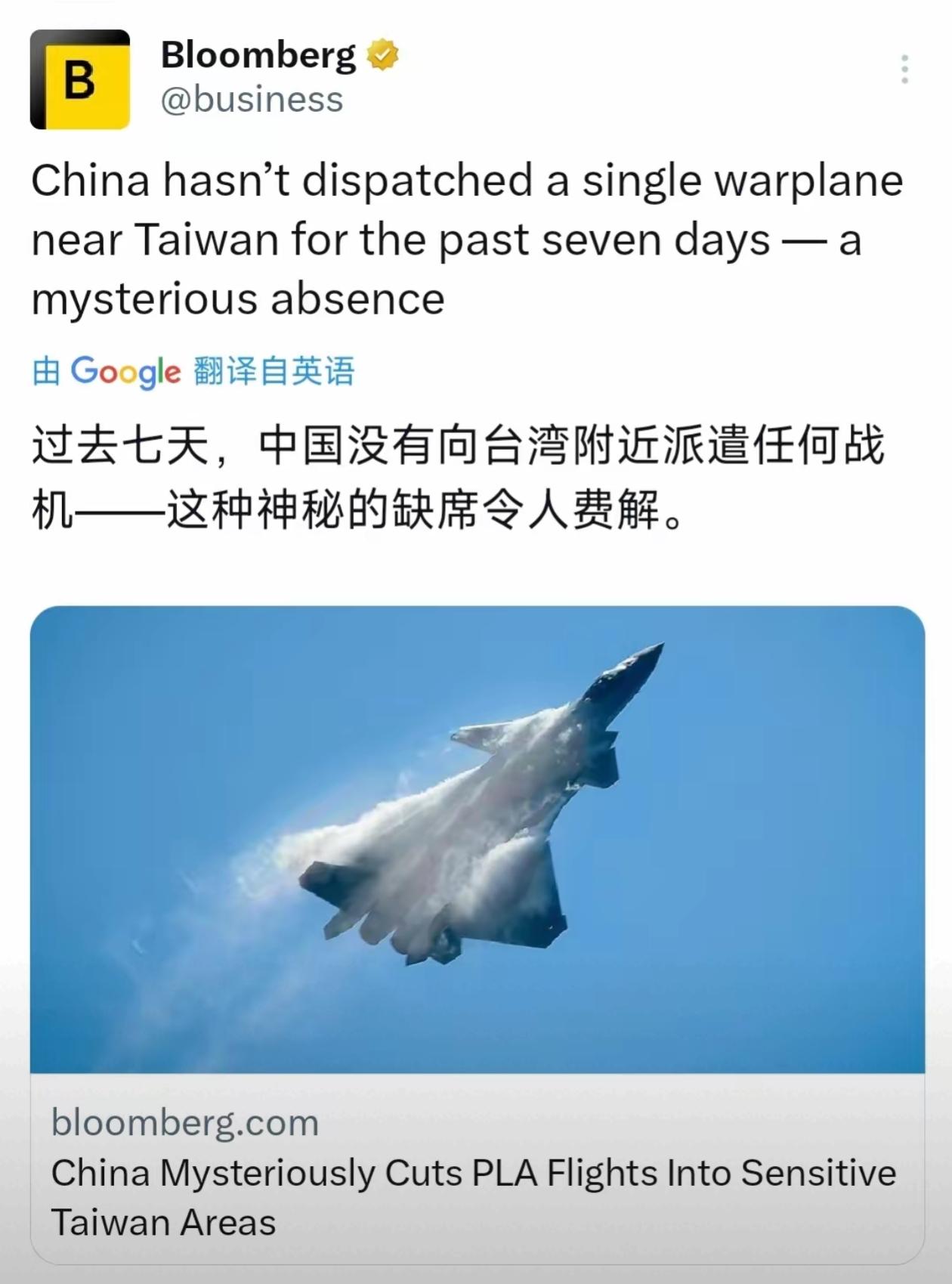 中国大陆连续7天没有向台湾附近派遣任何战机,彭博社认为这种神秘的缺席令人费解。 这种变化让彭博社感到疑惑不解,说明人家还是很关心解放军的。台湾是中国的神圣领土,台湾周边空域解放军想来就来,想不来就不来,水无常形,兵无常势,动中有静,静中有动,这才是解放军的厉害之处。 我们的地盘我们自己做主,别人管不着。