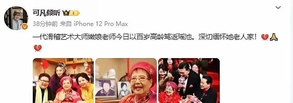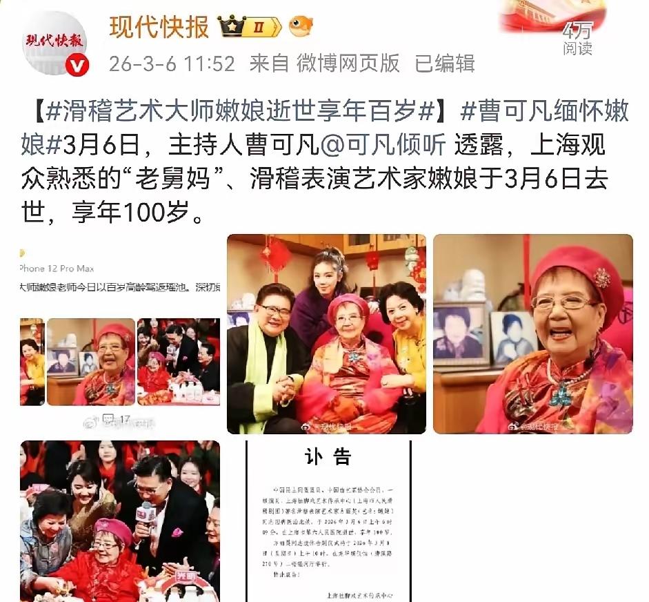 曹可凡,哀痛发文! 3月6日上午,许久没有消息的主持人曹可凡,突然在社交平台悲痛发文,沉痛的宣布了滑稽艺术大师嫩娘,于当日驾返瑶池,享年100岁,这句“深切缅怀她老人家”,瞬间让无数上海观众红了眼眶 。 嫩娘原名方丽英,十二岁便踏入演艺界,从上世纪五十年代开始活跃在滑稽舞台,近八十年的生涯里,用鲜活表演为观众带去数不尽的欢笑。 去年十一月,滑稽界还热热闹闹为她举办了百岁寿诞,当时她精神矍铄,还能和同仁们亲切互动,如今突然离世,让所有人都猝不及防。 早年的嫩娘凭借《活菩萨》里的潘丽蓉一角,迅速奠定了“滑稽花旦”的地位,这部剧目当时连演超过五百场,场场座无虚席,成了上海滑稽界的经典。 后来她在《三毛学生意》里饰演的小英一角,灵动又鲜活,还因此随剧组得到周总理的接见,这份荣誉不仅是她个人的骄傲,更是整个海派滑稽界的荣光。 真正让她走进千家万户的,是《老娘舅和他的儿孙们》里的“老舅妈”,这个慈祥亲和的形象,像极了上海弄堂里的邻家长辈,陪着无数人度过茶余饭后的时光。 她一生都恪守“做人勿演戏,演戏要生活”的信条,不管是花旦、老旦还是反派角色,都能演绎得入木三分,用真实的生活质感打动每一位观众。 嫩娘的离世,不仅是一位老艺术家的远去,更是海派滑稽一个时代符号的谢幕,她用近八十年的坚守,让海派滑稽从专业舞台走进了普通人的生活日常。 如今海派滑稽正面临传承的挑战,像嫩娘这样能把生活融入表演的艺术家越来越少,她留下的“生活化表演”信条,成了后辈们需要继承和发扬的宝贵财富。 有网友在评论区哭着留言:“哭了哭了…才发现老舅妈已经走了,笑声陪我长大的啊!”这份直白的不舍,正是无数观众的心声。 从曹可凡的悼文到网友的真情留言,处处都流露着对嫩娘的不舍与怀念,她用一生的表演,把海派滑稽的幽默与温情传递给了几代人,也用自己的艺术信条,诠释了何为真正的表演艺术家,那么,嫩娘的艺术人生,究竟给我们留下了哪些值得深思的启示呢? 在我看来,嫩娘之所以能被这么多人铭记,除了精湛的演技,更重要的是她把观众当成了家人,就像“老舅妈”一样,没有距离感,只有实打实的温暖,现在很多演艺从业者追求流量噱头,反而忘了表演的本质是贴近生活,嫩娘的“做人勿演戏,演戏要生活”,值得所有搞艺术的人好好琢磨,毕竟能留在观众心里的,从来都是最真实的感动。 这事你怎么看?