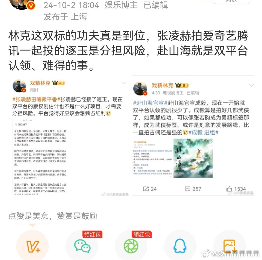 知道为什么看到逐玉平台待遇好,ie全平台发疯吗?当初e脂林克踩逐玉没人看好才会双平台,捧自己家的双平台剧山海关,现在铁一般的事实证明平台非常看好逐玉,待遇非常好。