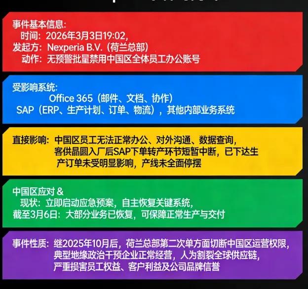 真的太离谱了!!! 远在荷兰的总部,手指一点,中国几千名员工瞬间无法办公、无法沟通、无法查数据。没有通知,没有预警,直接把中国区全体员工账号禁用。就在2026年3月3日傍晚7点,安世(中国)员工在毫无预兆之下被Nexperia B.V.(荷兰总部)把公司账号批量禁用了。从而导致了中国区域内的员工Office 365,SAP(影响最大),其他内部业务系统全部瘫痪。 下班前的最后几分钟,几千名员工的电脑集体陷入停摆,工作进度、沟通记录、业务数据全被切断。这种无视基本职场伦理的粗暴操作,把在华员工当成可随意操控的工具,连最起码的尊重与告知都不愿给予。 安世中国承担着全球**70%**的功率半导体封测产能,年产器件超900亿件,服务宝马、大众、比亚迪等全球车企。荷兰总部一次远程操作,直接威胁这条关乎全球汽车供应链的核心生产线。 SAP系统管控着从晶圆入库到生产排产的全流程,新订单转产环节当场中断,只有已上线生产的订单得以保全。短短几分钟的操作,给企业带来的直接经济损失与交付风险,难以用数字简单衡量。 这场闹剧并非临时起意,此前荷兰方面已冻结中资股东权利、罢免中方管理层,在供应链卡脖子失效后,转而用IT权限打压中国团队,把企业治理纠纷转嫁到普通员工身上。 安世中国近4000名员工扎根岗位多年,用汗水撑起企业超**62%**的全球营收,他们是产业链的中坚力量,不该沦为权力斗争的牺牲品,更不该在无预警情况下被剥夺工作权利。 中国团队早有准备,2026年全面切换国产晶圆,与鼎泰匠芯、芯联集成建立稳定合作,不再依赖荷兰供应。事件发生后200多名工程师连夜抢修,仅用三天便恢复大部分核心业务。 法律层面来看,远程批量禁用办公账号,已涉嫌侵犯劳动者合法权益,违背中国劳动法规与职场基本准则。跨国企业在华经营,必须遵守当地法律,而非任由境外总部肆意妄为。 不少业内人士直言,荷兰总部的做法既短视又愚蠢,伤害的是员工信心,动摇的是客户信任,最终会让安世品牌在全球市场失去口碑,搬起石头狠狠砸了自己的脚。 员工们在社交平台自发发声,字里行间满是委屈与愤怒。他们兢兢业业完成生产任务,却要承受无妄之灾,这样的企业管理方式,注定留不住人心,更走不长远。 这一事件给所有在华跨国公司敲响警钟,中国市场欢迎合作与投资,但绝不接受霸权式管理。尊重本土员工、遵守中国法律,是立足市场的最低底线。 它也让我们看清核心系统自主可控的重要性,过度依赖境外总部的IT架构,随时可能面临被“卡脖子”的风险,加快数字与供应链自主,才能真正守住产业安全。 越来越多的中国企业开始搭建独立办公与生产系统,把核心数据与运营权限握在自己手中,不再给境外势力随意干扰的机会,这是产业发展的必然选择。 商业的根基是信任与尊重,不是强权与操控。荷兰总部用最极端的方式破坏合作基础,丢掉的不仅是企业信誉,更是在全球半导体赛道的竞争底气。 中国产业链的韧性与中国员工的担当,在这次事件中展现得淋漓尽致。我们有能力应对外部干扰,更有底气守护属于自己的发展成果与劳动尊严。 各位读者们对这件事怎么看?请在评论区留言。