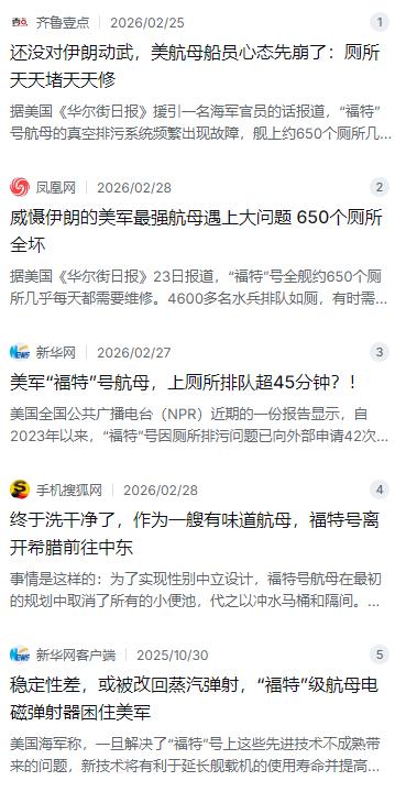 美国航母成了世界笑话!谁都没想到,逼疯美国“福特号”航母上4600名水兵的不是伊朗的导弹,而是一个简单的不能再简单的真空系统! 爱琴海3月的风还带着寒意,吹过希腊克里特岛的补给码头。要是从天上往下看,那艘造价130亿美元、号称美国海军最强战力的"福特号"航母,正安安静静地停在碧蓝的海水里,看着就像一座能移动的钢铁城堡。可你要是真走近了,凑到舷窗边上,扑面而来的可不是什么海风的咸味儿,而是一股能把人熏晕过去的、浓得化不开的粪臭味! 2026年3月4日的今天,这艘全世界最先进的航母,正在上演一场让人笑掉大牙的崩溃大戏。击垮它的不是什么鱼雷导弹,而是藏在甲板下面、那根只有10厘米粗的排污管子。 此时此刻,码头边上排着150个花花绿绿的塑料移动厕所,跟工地上、音乐节现场用的那种一模一样。这些简陋玩意儿,现在成了4600名美国大兵的"救命神器"。这画面有多讽刺?2017年服役时吹得天花乱坠的黑科技巨舰,如今在爱琴海上彻底成了国际笑话。 回溯过往,这场灾难的隐患实则早在2025年6月出港之际便已悄然埋下。彼时看似寻常的起航,却为后续的灾祸埋下了伏笔。为节约淡水资源,设计师灵机一动,竟将民航客机上的真空排污系统大胆应用于航母之上,此看似冲动之举,实则蕴含着别样的巧思。实验室里想得挺美,真空负压啥都能吸走,可现实狠狠打了脸——10厘米的管子根本扛不住几千号人天天往里排。更绝的是,为了搞什么性别平等,舰上把所有小便池全拆了,换成了清一色的马桶隔间。这种自以为是的"先进设计",直接让马桶使用频率炸了。 从2025年下半年开始,随着部署任务从原定的6个月一路拖到9个月甚至更久,水兵们的心态先崩了。见不着家人,拿不到加班费,长期高压之下,愤怒的士兵开始往马桶里塞T恤、抹布、各种垃圾。这哪是恶作剧?这分明就是一种无声的、绝望的反抗。 后果有多惨?全舰650个厕所分成10个大区,这种串联设计意味着"一个堵,全区废"。最黑暗的那几天,工程部门4天内收到205次故障警报,高峰期每小时就得响3次。现在,剩下能用的马桶成了稀缺资源,平均70个人抢一个坑,排队45分钟起步是常态。 在昏暗的舱室走廊里,到处都是脸色煞白、双腿打颤的水兵,甚至有人被逼得在淋浴间角落或者用水桶解决。那些被叫做"马里奥"的维修技师,每天工作19个小时,他们不是在调试什么高科技电磁弹射器,而是在满地黄褐色污水里通管子。 为了维持这点可怜的体面,美国海军只能疯狂烧钱续命。每次大规模疏通,都得往管子里灌特制的强酸药水,一次就烧掉40万美元。这笔接近300万人民币的开销,只能换来几天的安宁,然后结晶再次附着,管道再次堵死,恶臭再次袭来。 最具讽刺意味的是什么?早在2020年,美国政府问责局便明确指出管道设计存在致命缺陷。然而,这样的预警在“大国竞争”的宏大叙事之下,被有意无意地选择性忽视了。现在,那些原本打算明年退伍的水兵们,在这个3月的清晨,看着码头上那一排排移动厕所,眼神里只剩下了绝望。 一个连士兵如厕尊严都无法保障的武器平台,即便配备再多先进导弹,又有何用?徒具其表的武力堆砌,难掩对人性关怀的缺失,终究难以成就真正的强大。福特号的尴尬狠狠提醒了所有人:大国的肌肉不能只长在弹射器和雷达上,更得落在每一个最基础的民生细节里。强酸或许能洗掉管壁上的结晶,却洗不掉这艘130亿美金巨舰在全世界眼中留下的荒诞底色。