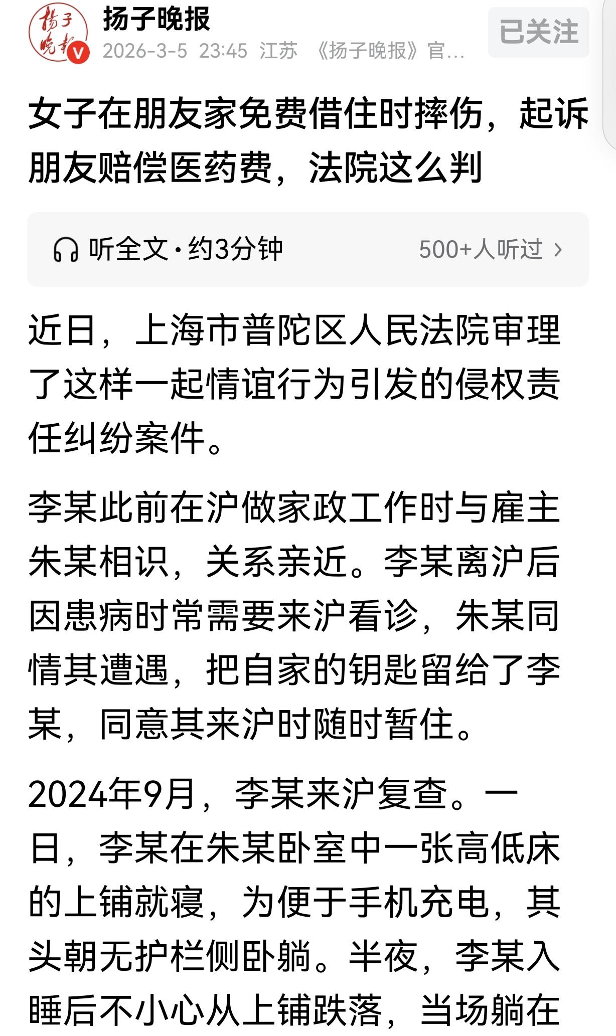 “白眼狼!”上海,一女子做保姆时,跟雇主关系亲如姐妹,她上海医院看病,雇主把家里的钥匙给了她,热情的让她住在家里,给她省下住酒店的钱看病,万万没想到,女子睡到半夜,从高低床掉下来,导致脊髓摔伤,她立马翻脸,觍着脸跟雇主索赔医药费。雇主觉得自己太冤了,拒绝当冤大头,竟被女子告上法庭,法院判了。 朱女士和曾经在自己家做保姆的李某关系特别好,两人很对脾气,没有雇佣之分,处得亲如姐妹。 后来李某回了老家,但因为身体不太好,时不时就得来上海的大医院看病。 每次来上海,住酒店都是一笔不小的开支。朱女士心疼她,觉得她看病本就花了不少钱,能省一点是一点。 朱女士便主动把家里的钥匙给了她,热情地邀请她住到自己家里,这样既方便照顾,又能帮她省下住酒店的费用。 李某也欣然接受了这份好意,每次来上海都直接住进雇主家。 2024年10月,保姆又来上海复查。朱女士像往常一样,把家里收拾得干干净净,让她安心住下。 头几天,保姆一直睡在客厅的沙发上,沙发虽然不算特别舒服,但也还凑合。 可有一天,她看到卧室里有一张高低床,想着睡床可能比沙发更舒服些,便决定睡到高低床的上铺去。 晚上,保姆为了方便给手机充电,没有按照正常的睡姿,而是把头朝着没有护栏的那一边侧着身子躺下。 她可能觉得这样没什么大不了的,可危险就在这不经意间降临了。 半夜,她睡得迷迷糊糊,一个翻身,整个人就从高低床的上铺掉了下来。 只听“砰”的一声,她重重地摔在了地上,当场就疼得动弹不得。 朱女士听到动静,赶紧从房间跑出来,看到保姆躺在地上痛苦的样子,心急如焚,立刻把她送到了医院。 经过检查,保姆脊髓摔伤,伤势严重,需要住院治疗,这无疑又是一笔巨大的开销。 李某伤好一些后,立马变了脸。她觉得雇主家的高低床护栏有问题,存在安全隐患,才导致自己摔下来受伤,所以要求雇主承担她的医药费。 雇主觉得特别冤枉,自己好心让她免费住家里,又没强迫她睡高低床,而且家里其他人睡这张床都没出过事,凭什么要自己负责呢?雇主坚决拒绝了保姆的要求。 没想到,保姆竟然一纸诉状把雇主告上了法庭。 这件事让我们看到,好心帮助别人,有时却可能换来“白眼狼”的反咬一口。 但即便如此,我们也不能因为害怕麻烦就放弃善良,只是在帮助别人时,也要多考虑一些,保护好自己。 这朱女士真是好心没好报,一片热忱把钥匙给李某,让她免费住家里,就为了帮她省点住酒店的钱。 结果,李某自己不小心从高低床摔下来,反倒怪朱女士,还狮子大开口索赔医药费,这行为太让人寒心了,妥妥的“白眼狼”。 朱女士的遭遇也给我们提了个醒,善良是好事,但善良得有边界。 在帮助别人的时候,不能只凭一腔热情,也要考虑可能出现的风险。 就像这次,朱女士好心提供住所,却没想到会被反咬一口。 以后遇到类似情况,或许可以提前和对方说清楚责任划分,或者留个书面协议,避免不必要的麻烦。 不过,我们也不能因为这一件事就否定所有的善意。 社 会上还是有很多懂得感恩的人,不能因为个别“白眼狼”的存在,就放弃去帮助他人。 只是大家在行善的时候,要多长个心眼,保护好自己,让善良能真正温暖到需要的人。 《民法典》第1165条规定,行为人因过错侵害他人民事权益造成损害的,应当承担侵权责任。 本案中,朱女士提供住所供李某居住,不存在过错行为,李某受伤是自身睡觉姿势不当所致,与朱女士无因果关系,所以朱女士无需担责。 最终,法院驳回了保姆的全部诉讼请求。 对此,你怎么看?