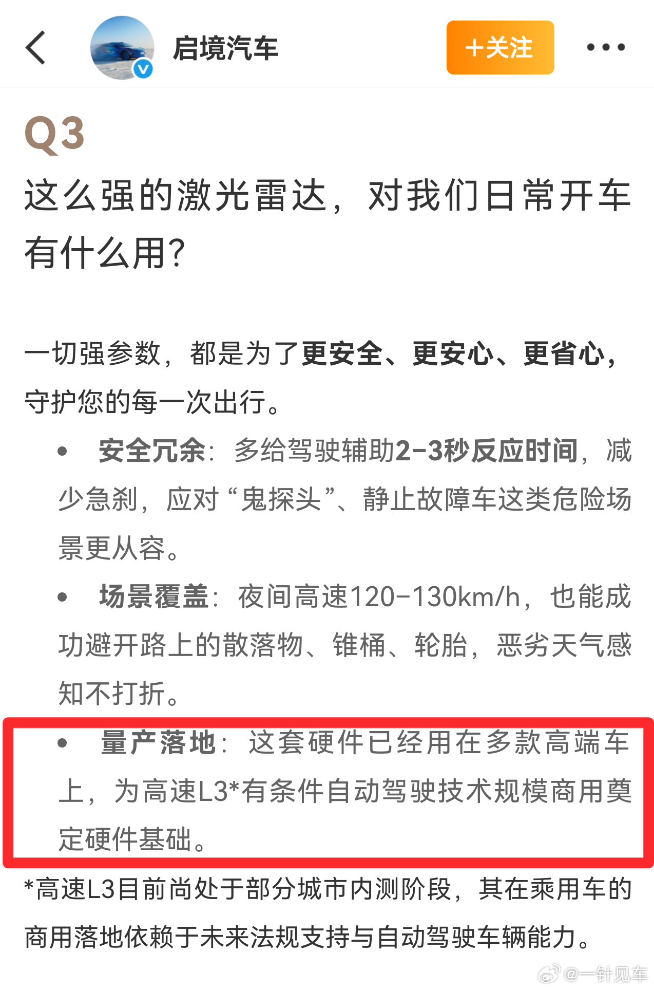 我第1天就做出的判断,今天启境汽车的文章里也写得很清楚了:“为高速L3有条件自动驾驶技术规模商用奠定硬件基础”。无论L3是什么时候批准,那时候这套硬件都会给一致的性能和体验,这是最关键的点。华为新激光雷达成像分辨率提升4倍