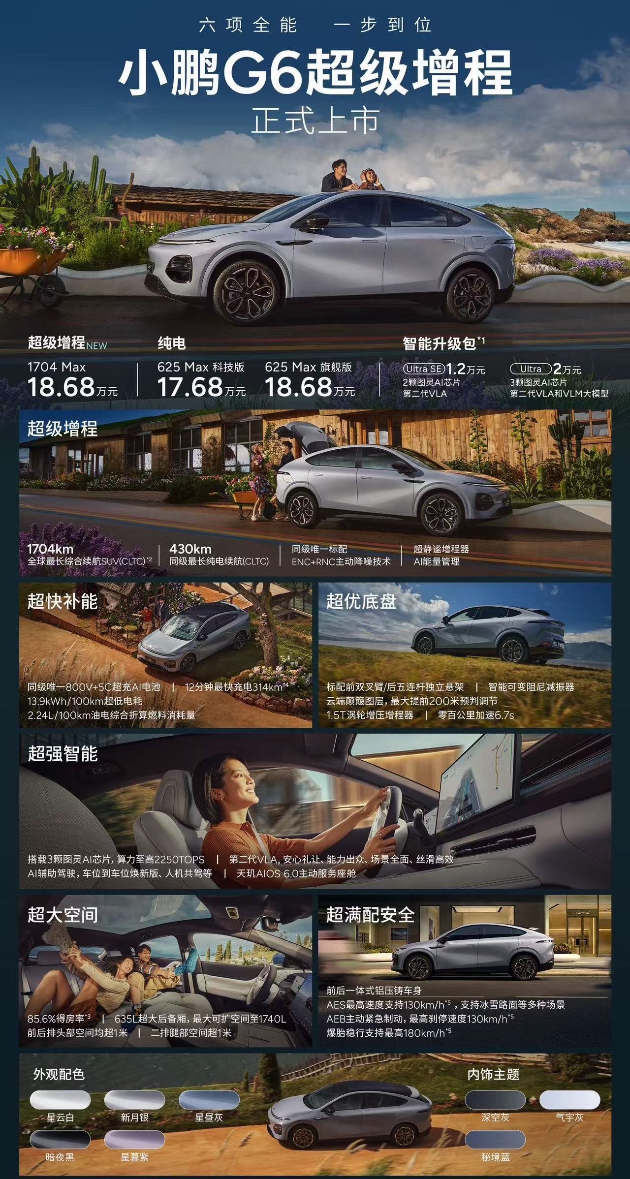 搭载第二代VLA智驾,顶配配3颗图灵AI芯片,支持全场景智驾与OTA持续升级;采用一体式铝压铸车身,标配高端悬架组合,同级首个 180km/h爆胎稳行。高空间利用率、静谧座舱适配家庭出行,凭续航、补能、智能、空间、操控、安全六大核心优势,成为20万级家用SUV优选。小鹏G6超级增程六项全能一步到位